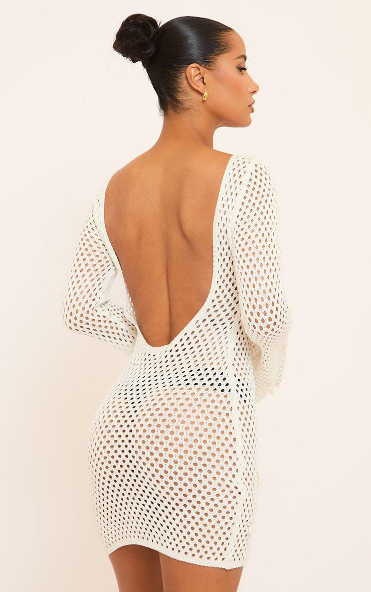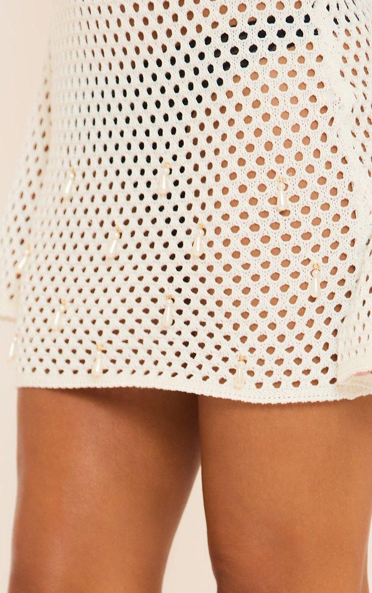 Long Sleeve Pearl Detail Mini Dress In White Crochet Knit