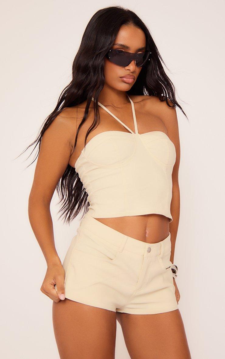 Halterneck Lace Up Detail Top In Stone Faux Leather