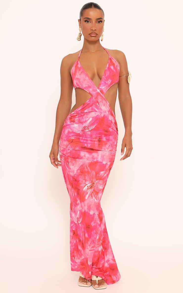 sleeveless plunge front cut out maxi dress in pink abstract print