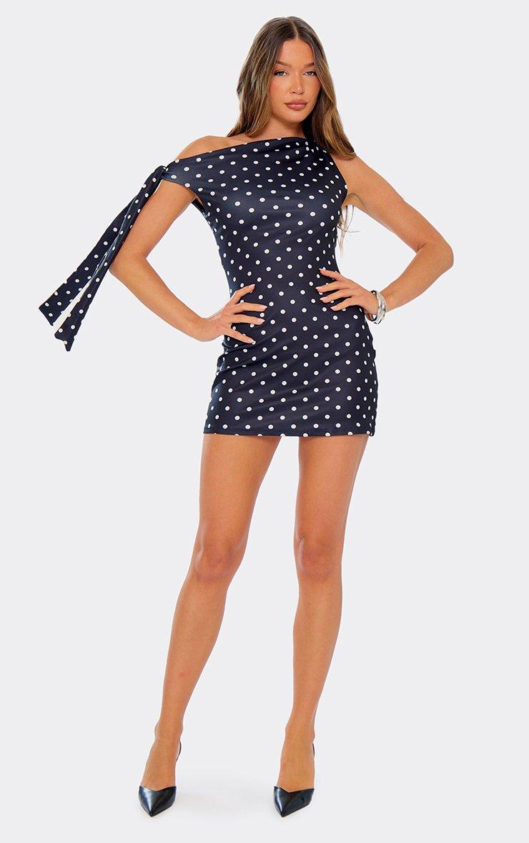 off the shoulder tie detail asymmetric mini dress in black polka dot