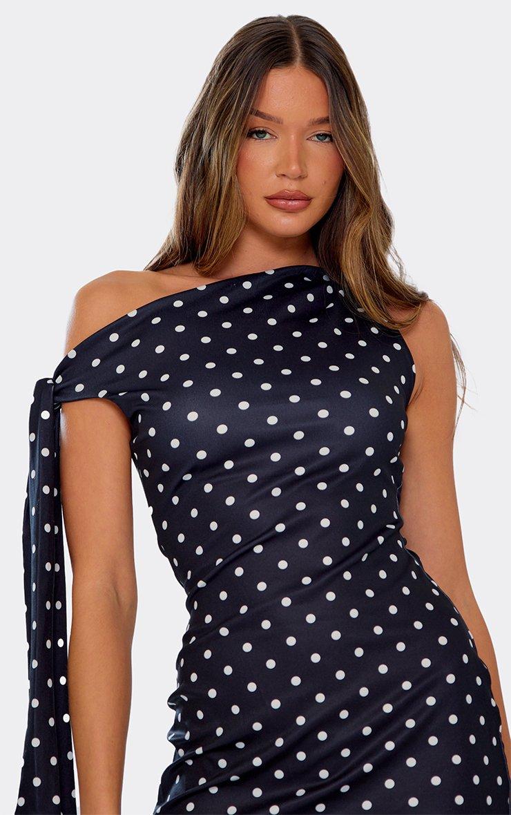Off The Shoulder Tie Detail Asymmetric Mini Dress In Black Polka Dot