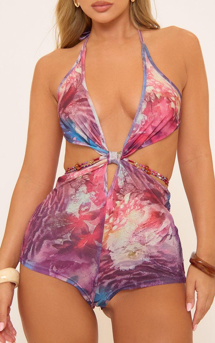Halterneck Cut Out Bead Detail Playsuit In Multi Printed
