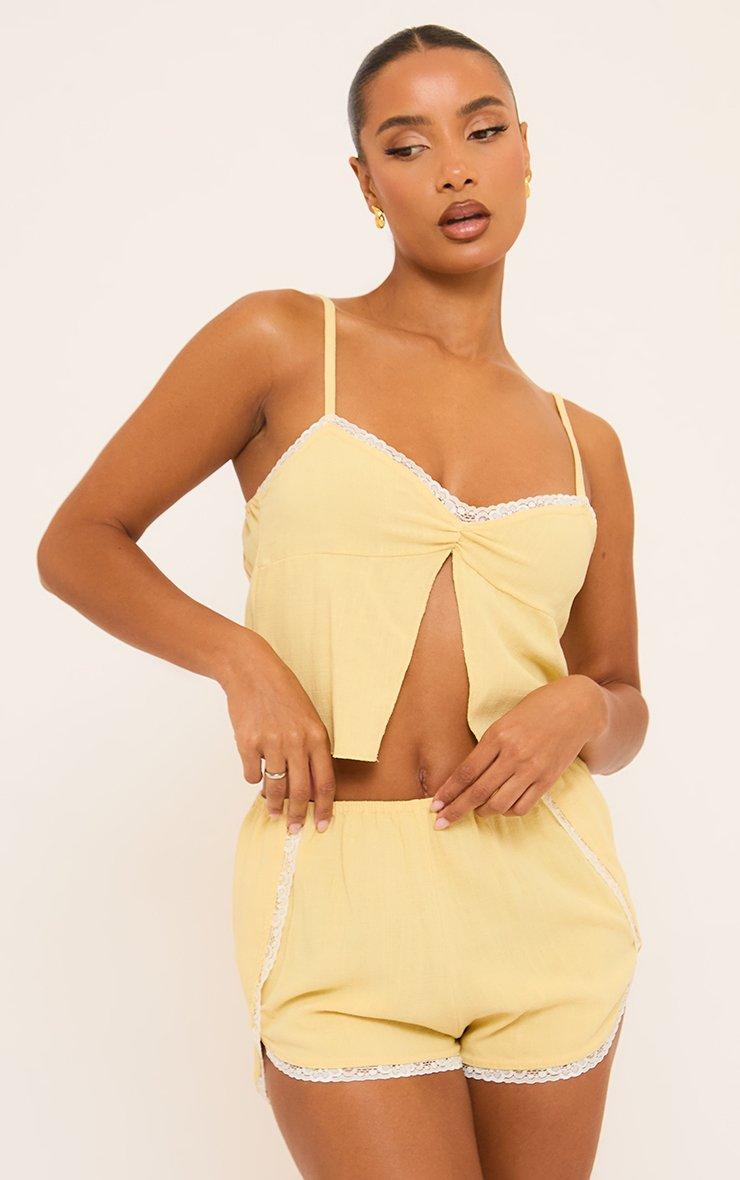 Strappy Lace Trim Detail Split Front Top In Yellow Linen
