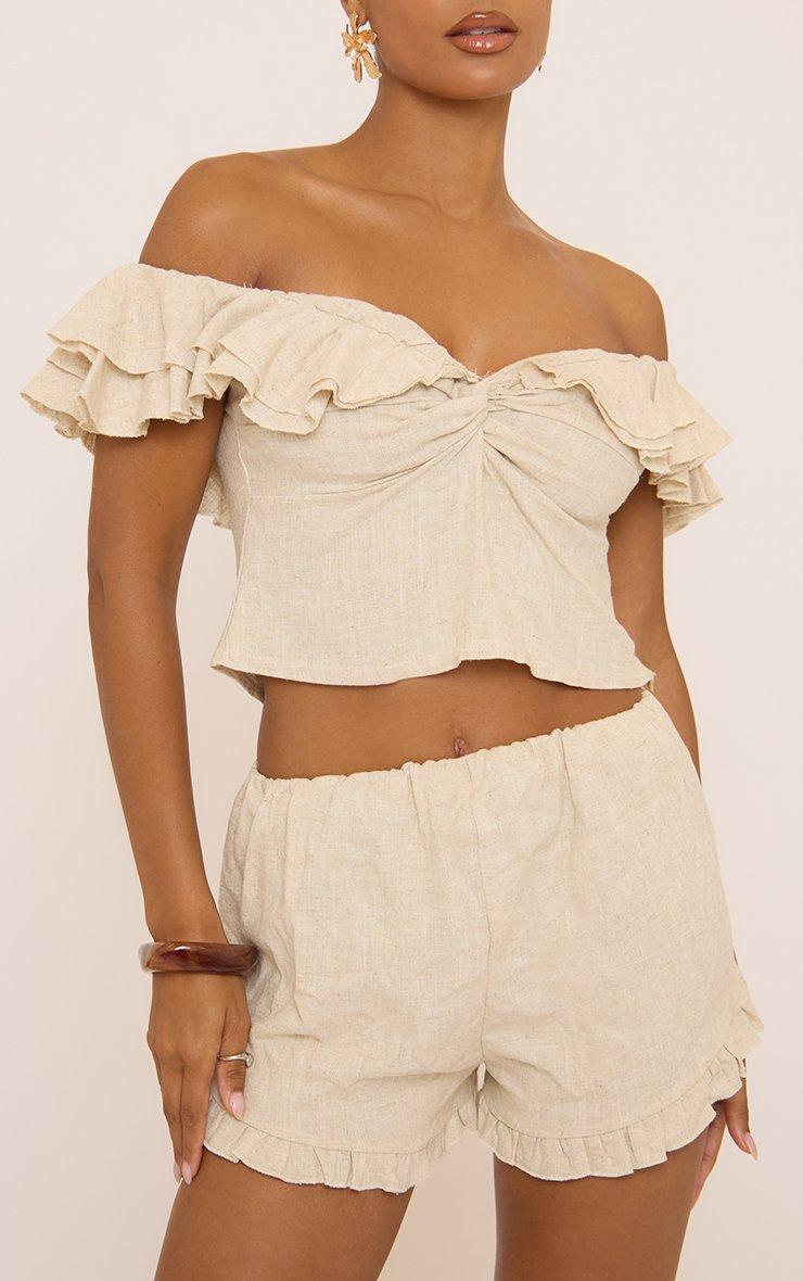 Bardot Off The Shoulder Frill Edge Top In Stone Linen