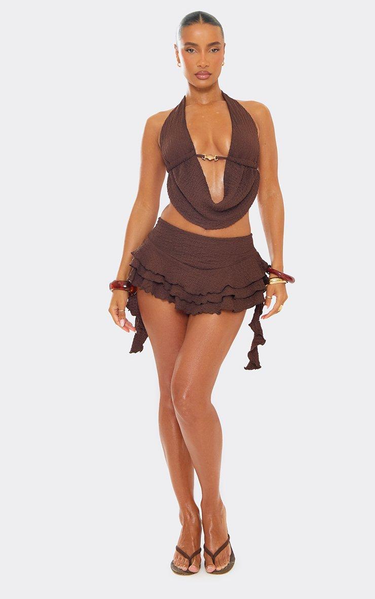 Mid Rise Frill Detail Hot Pant Shorts In Brown Texture