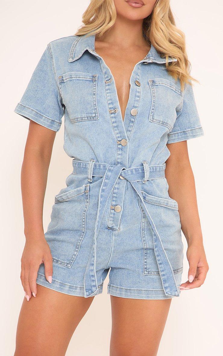 Short Sleeve Tie Waist Detail Button Front Collared Playsuit In Blue Denim