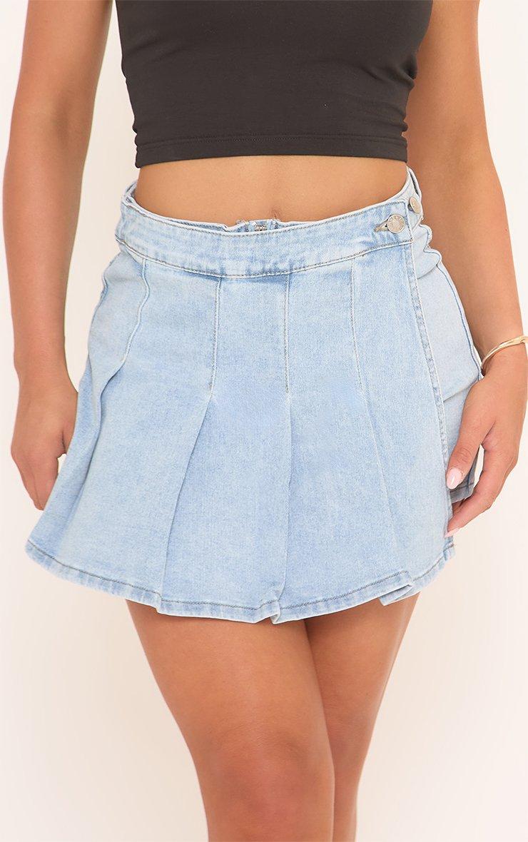 High Waist Wrap Over Pleated Skort In Blue Denim