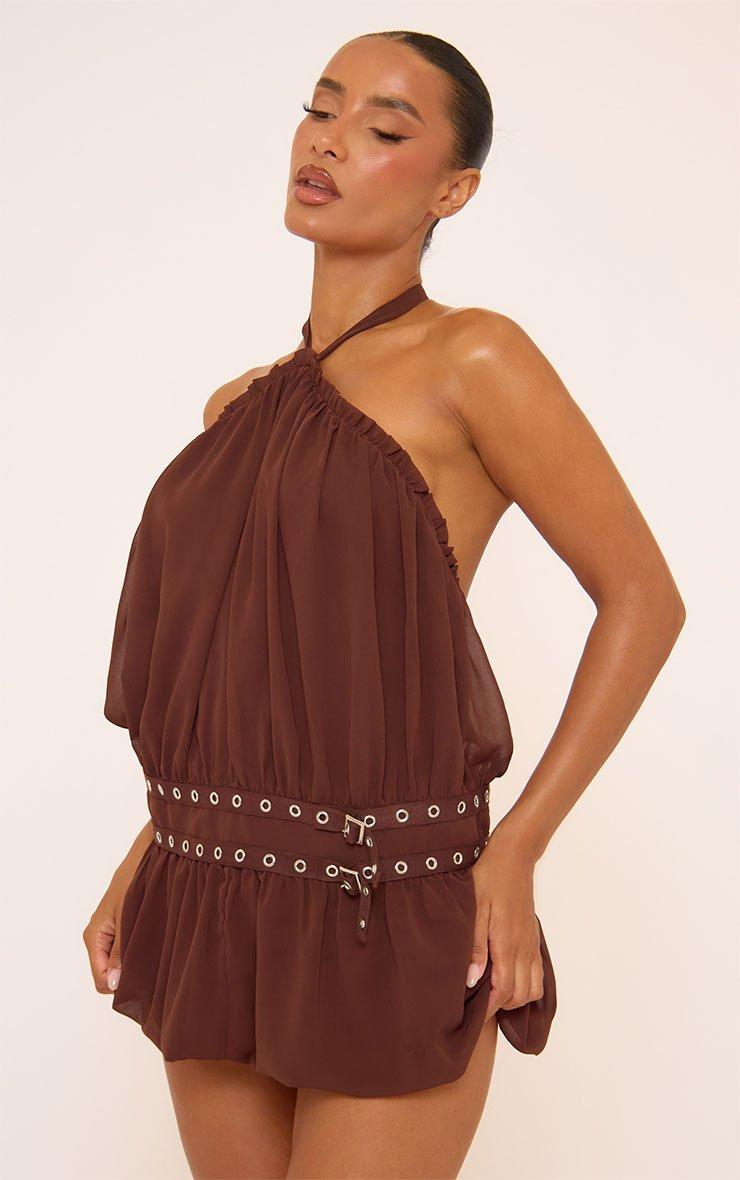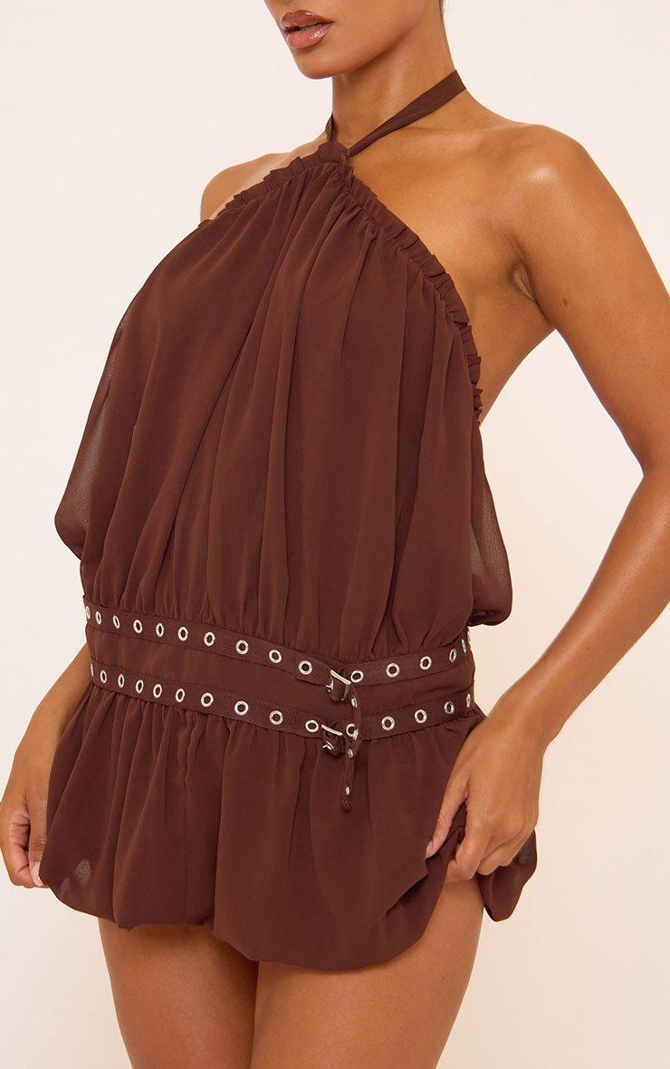 Halterneck Low Back Eyelet Belt Mini Dress In Brown