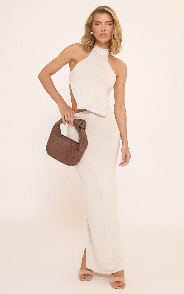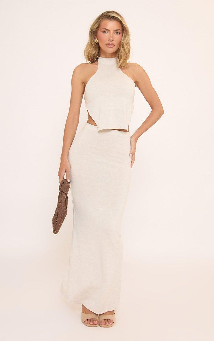 High Neck Open Back Top In Stone Soft Ribbed