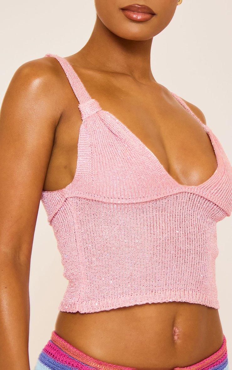 Plunge Neck Knotted Detail Fitted Cami Top In Pink Sequin Knit