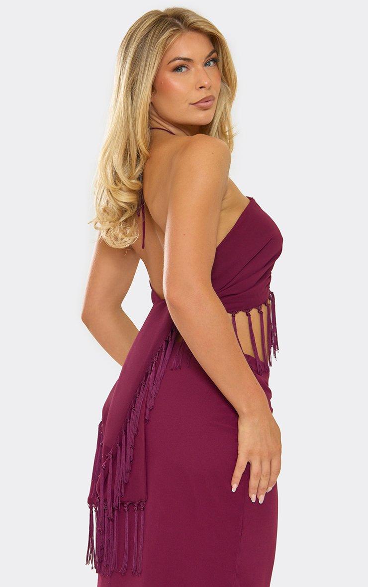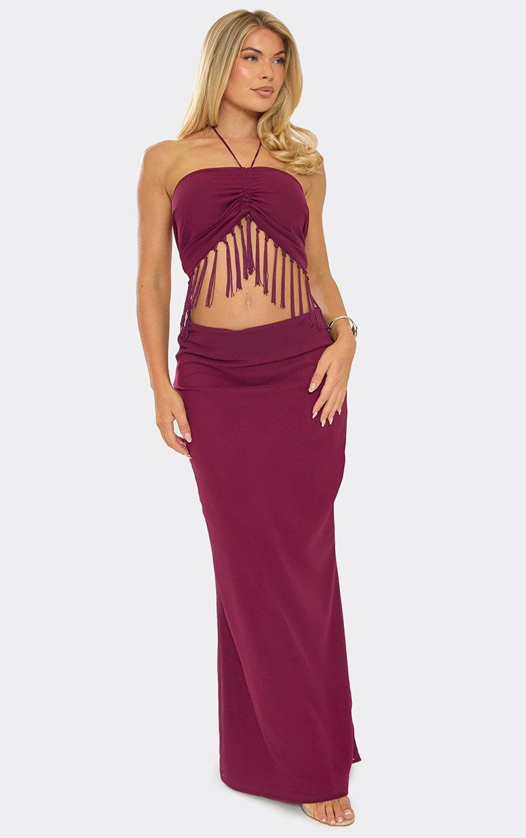 Halterneck Plunge Knot Front Detail Crop Top In Purple Slinky