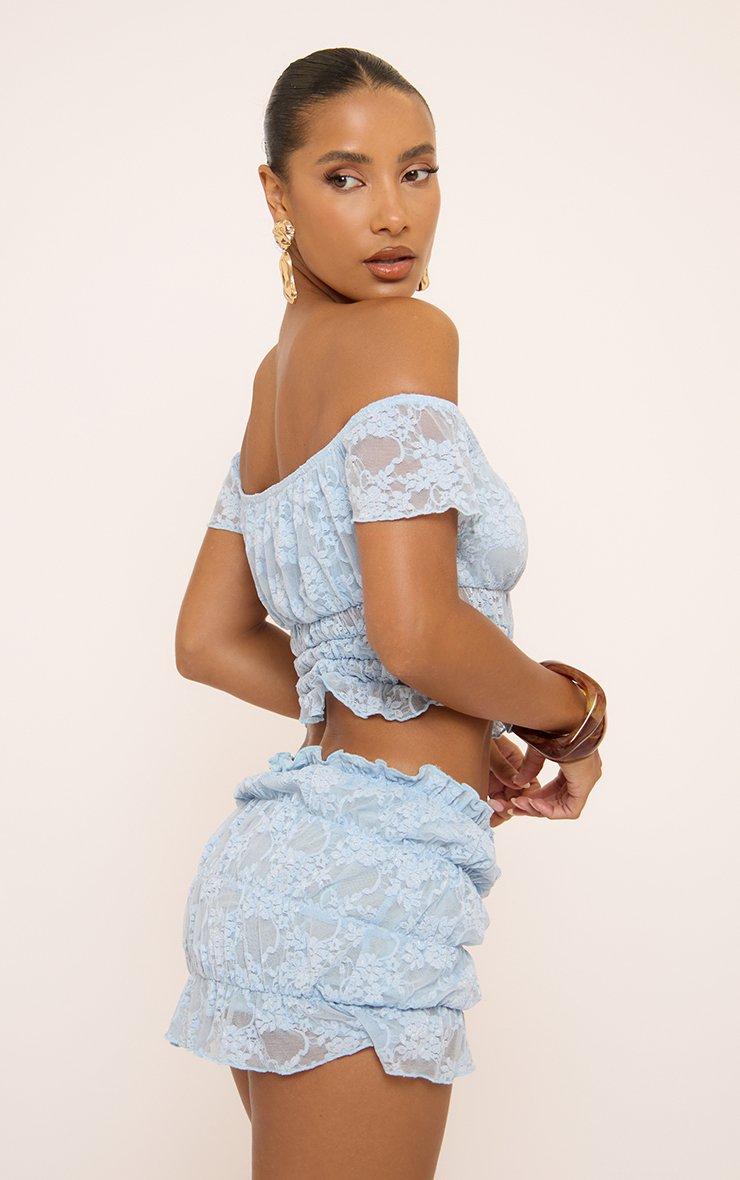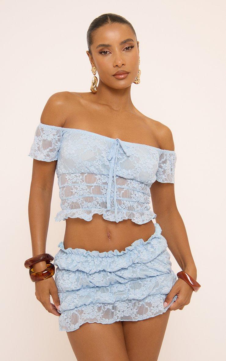 Mid Rise Mini Skirt In Blue Shirred Lace