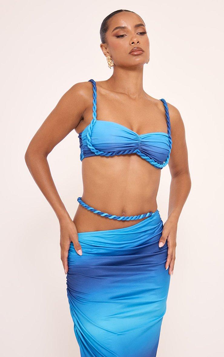 twisted strap ruched front bralet top and cut out detail maxi skirt co-ord set in blue