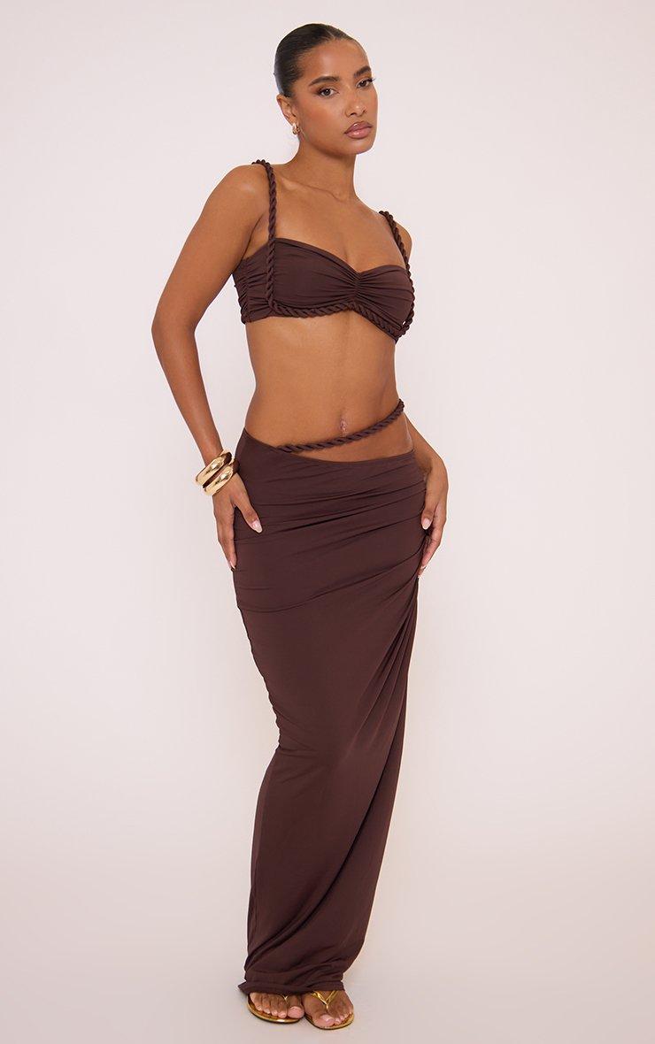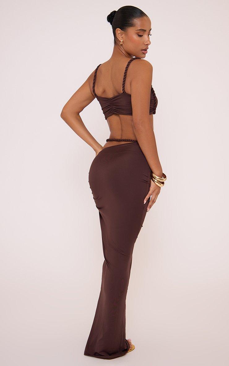Twisted Strap Ruched Front Bralet Top And Cut Out Detail Maxi Skirt Co-Ord Set In Brown