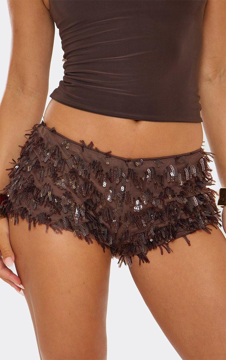 Mid Rise Hot Pant Shorts In Chocolate Brown Sequin
