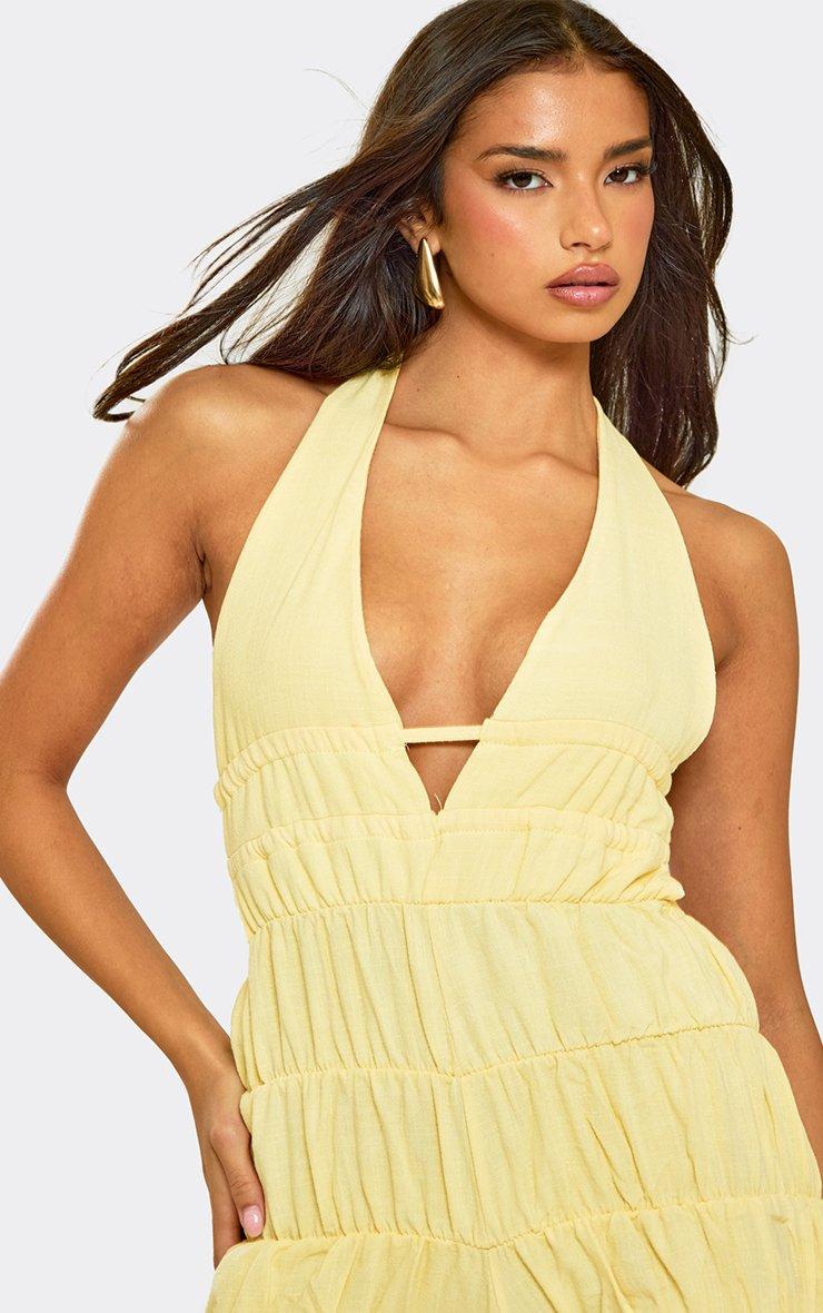 Plunge Halterneck Gathered Tie Back Playsuit In Yellow Linen