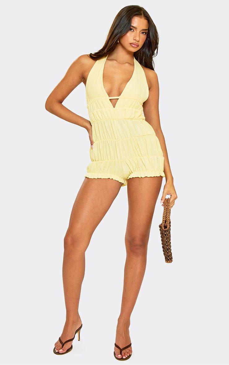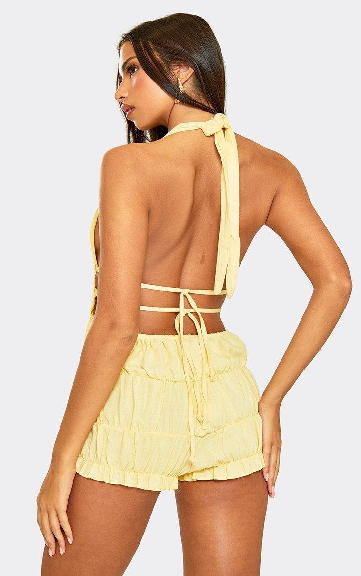 Halterneck Frill Detail Low Back Playsuit In Yellow Textured