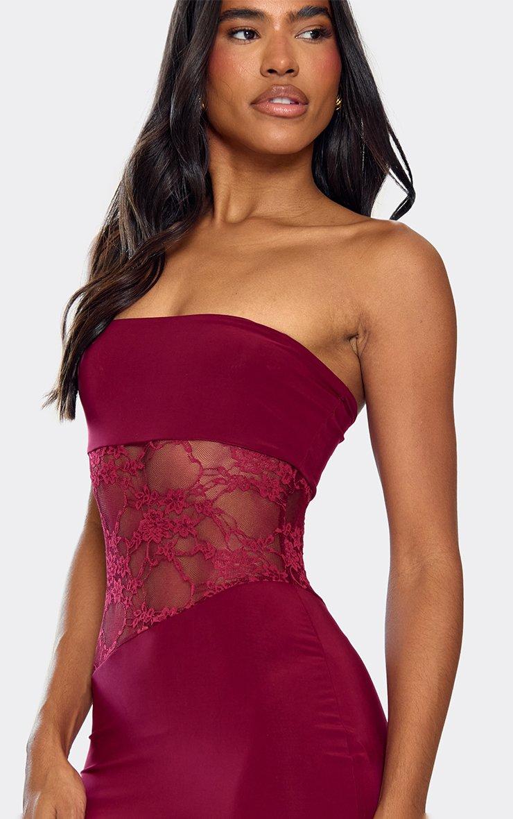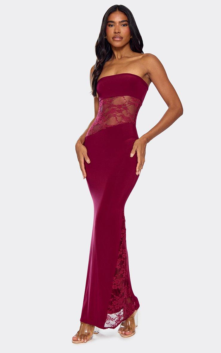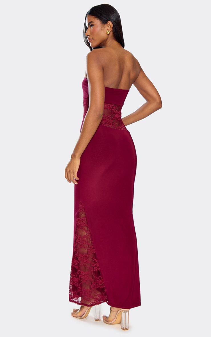 Strappy Cupped Contrast Lace Draped Panel Detail Maxi Dress In Burgundy