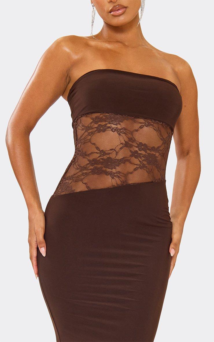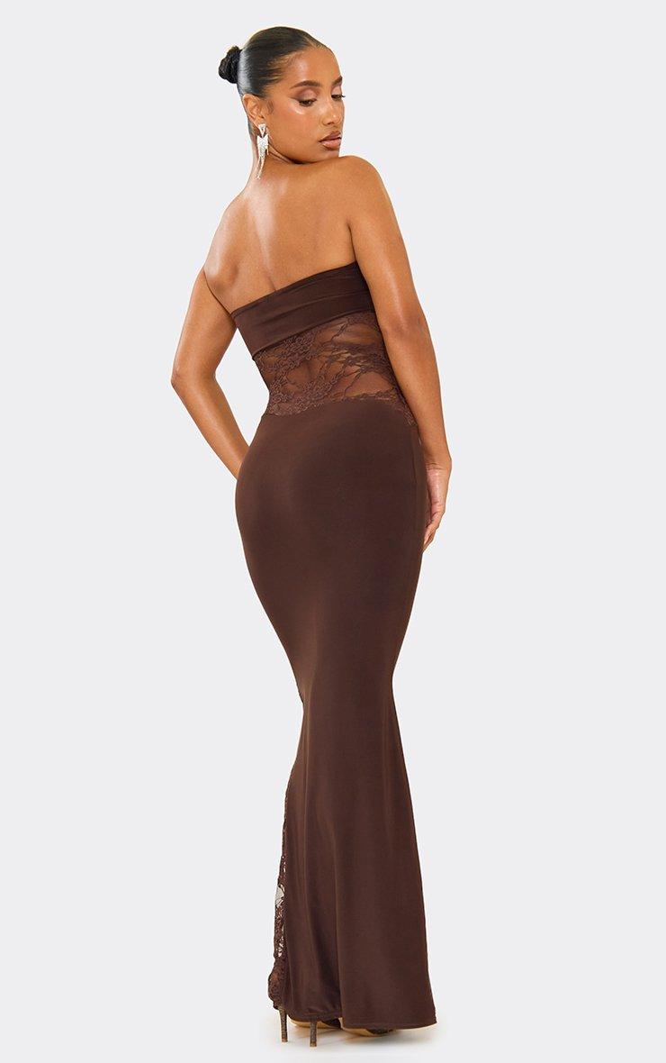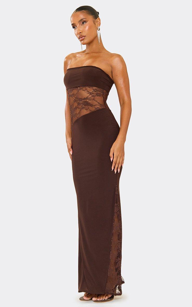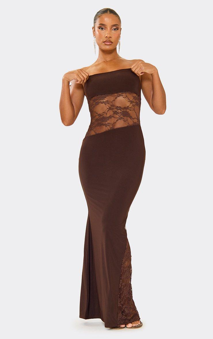 Bandeau Contrast Lace Cut Out Detail Maxi Dress In Chocolate Brown