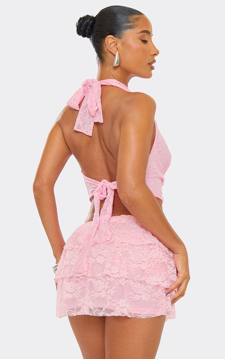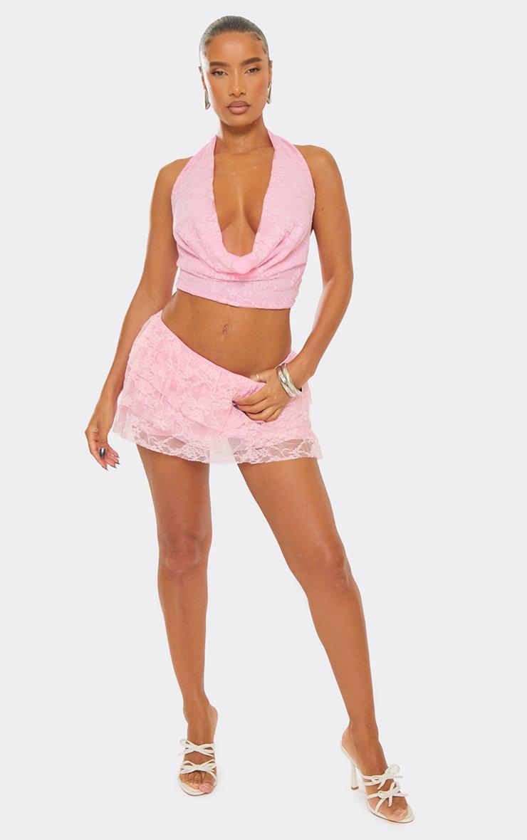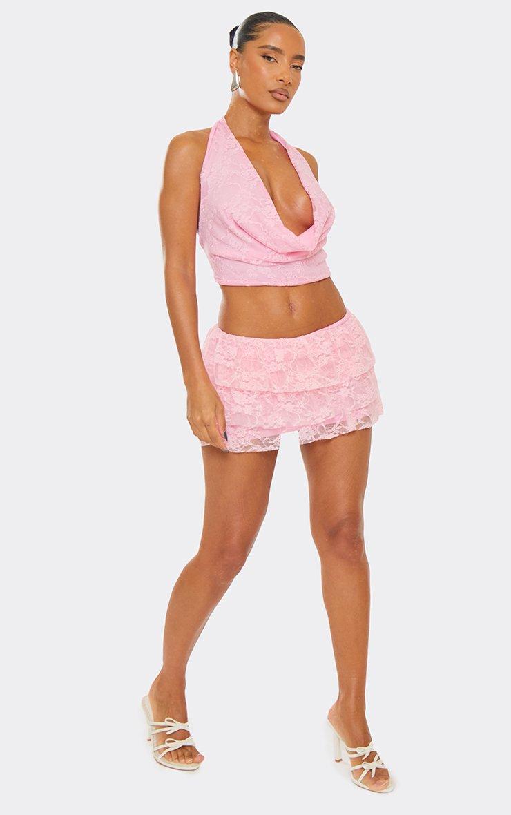 Mid Rise Tiered Frill Detail Mini Skirt In Pink Lace