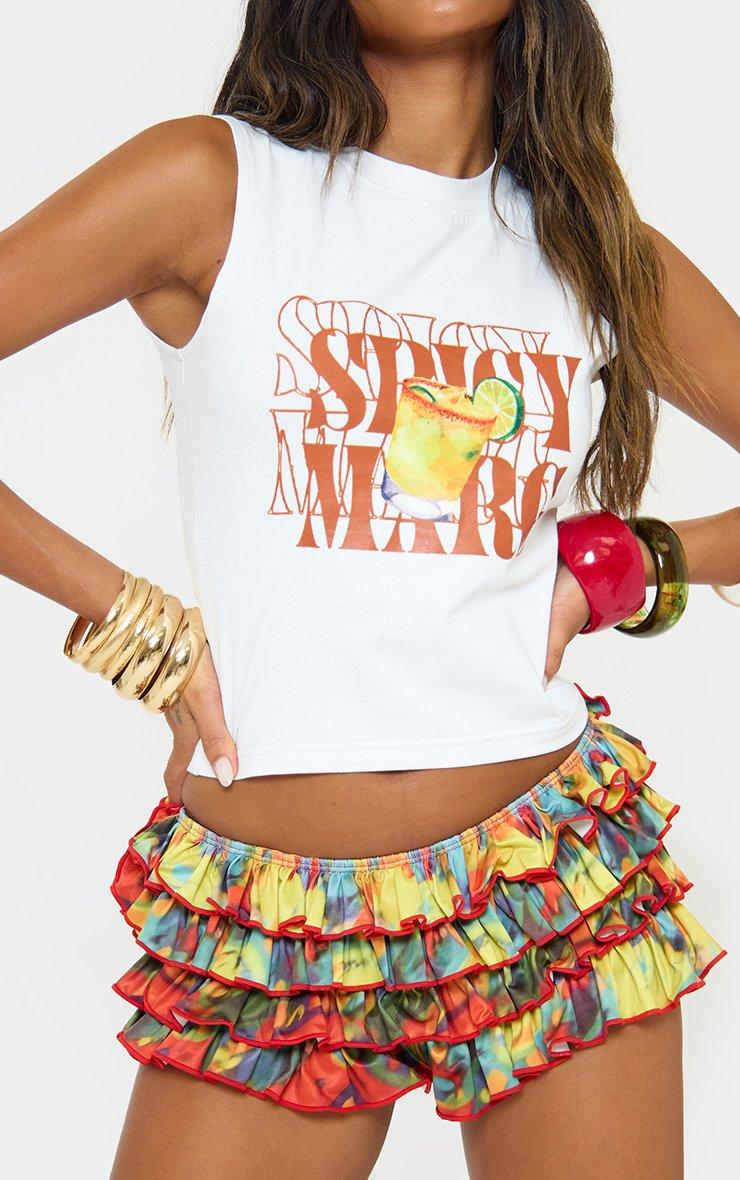 Low Rise Frill Detail Hotpants In Red Multi Abstract Print