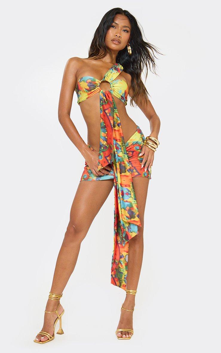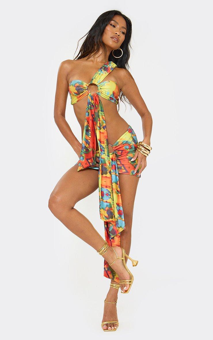 Mid Rise Embellished Tie Side Detail Mini Skirt In Multi Abstract Print