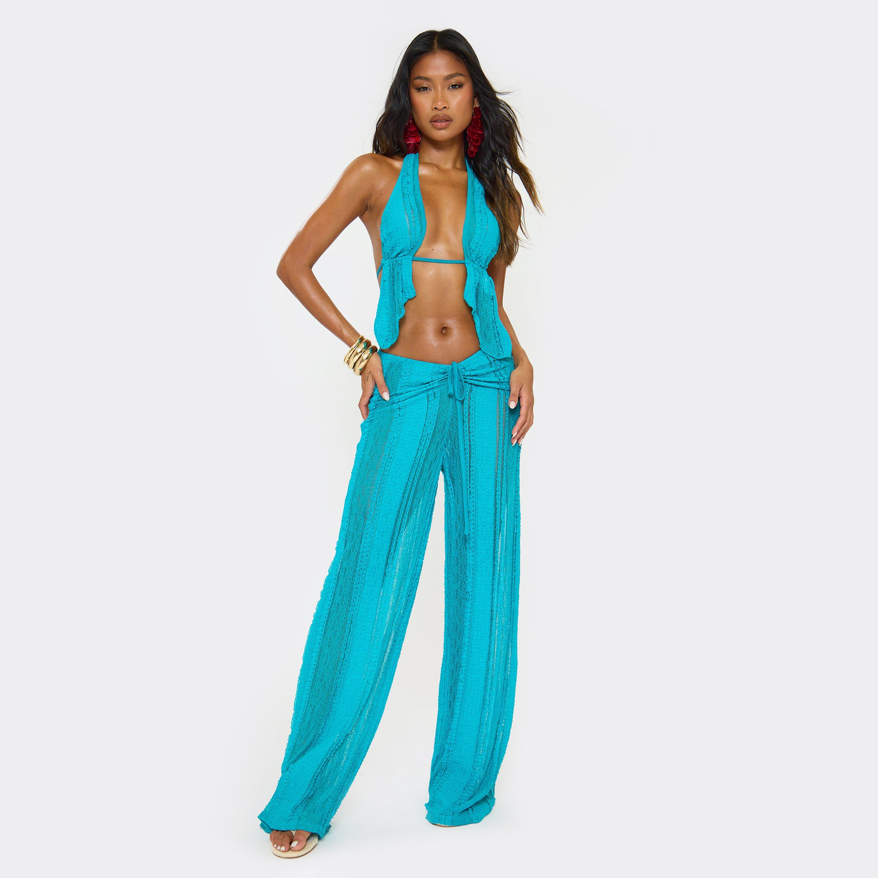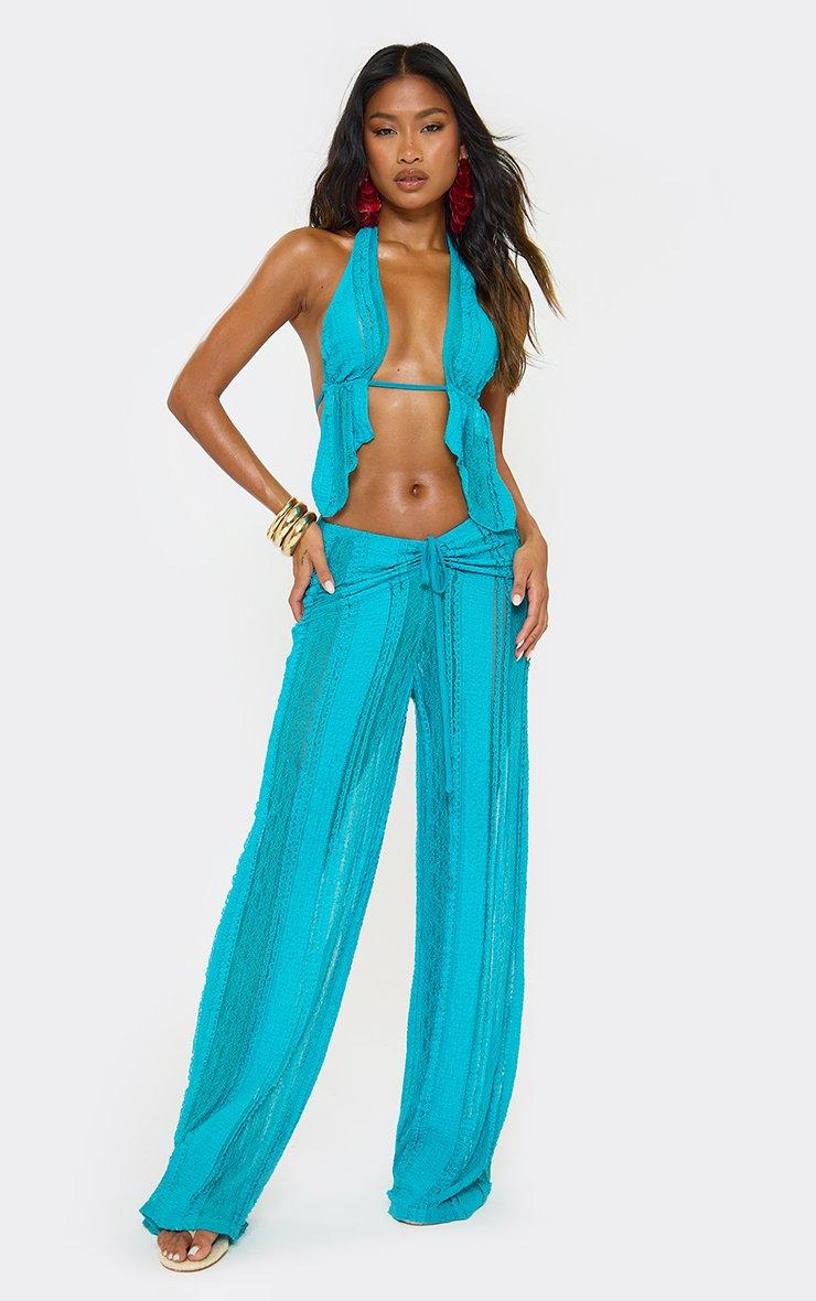 Low Rise Tie Waist Wide Leg Detail Trousers In Blue Linen
