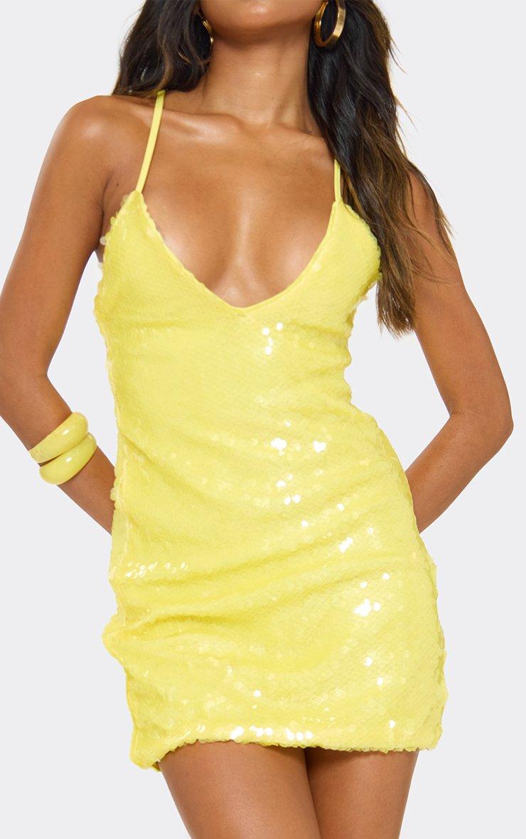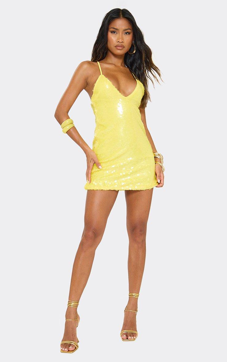 Plunge Neck Strappy Mini Dress In Lemon Sequin