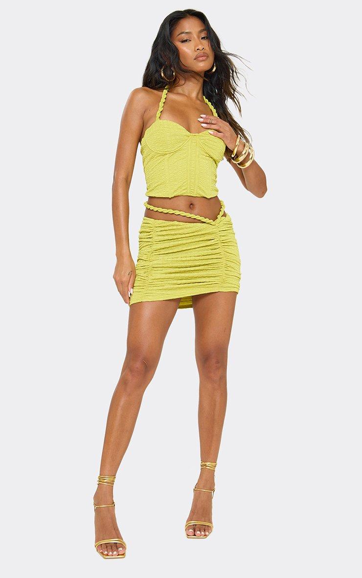 Mid Rise Rope Detail Ruched Mini Skirt In Green Texture