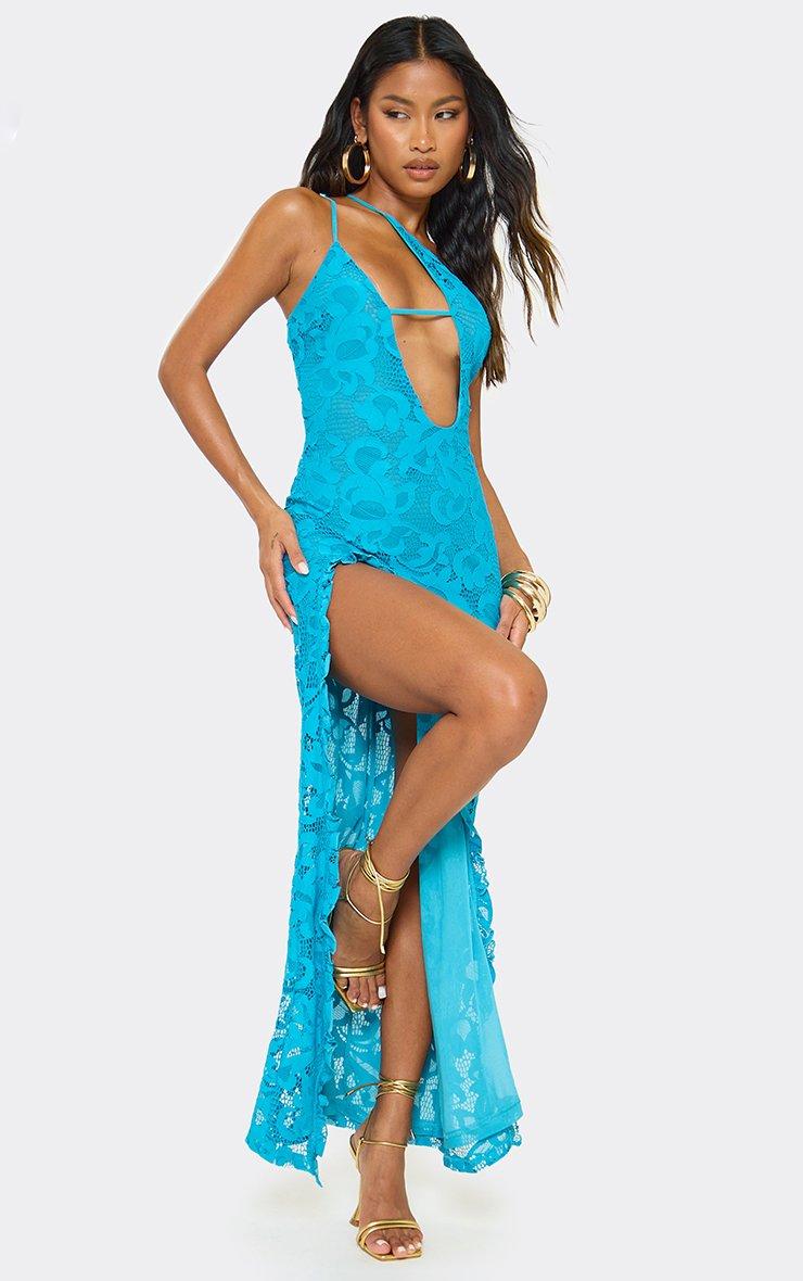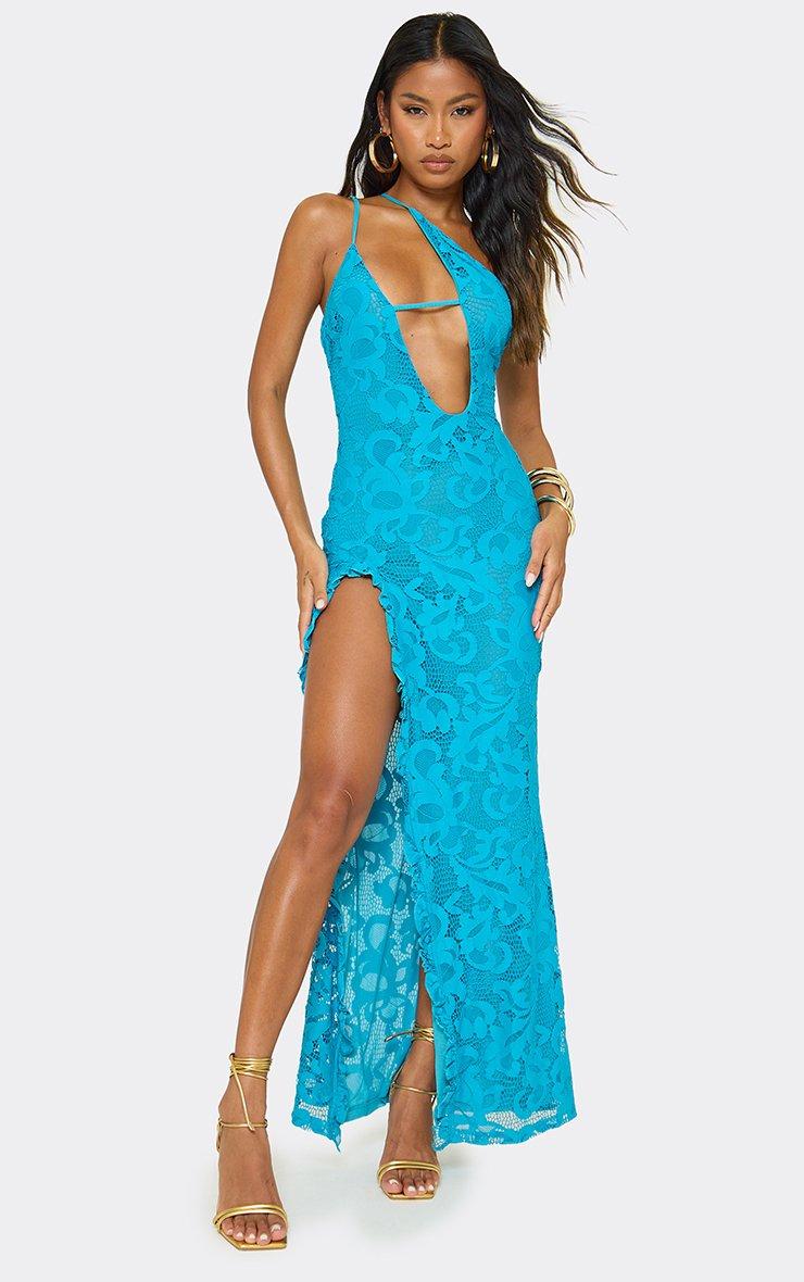 One Shoulder Cut Out Front Side Split Maxi Dress In Blue Lace