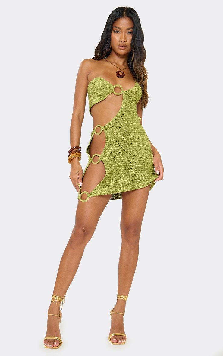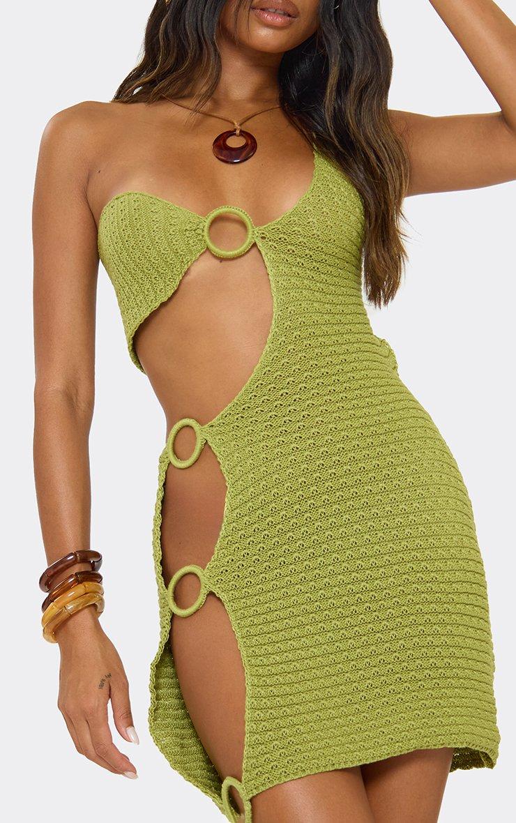 One Shoulder Cut Out Ring Detail Mini Dress In Green Knit