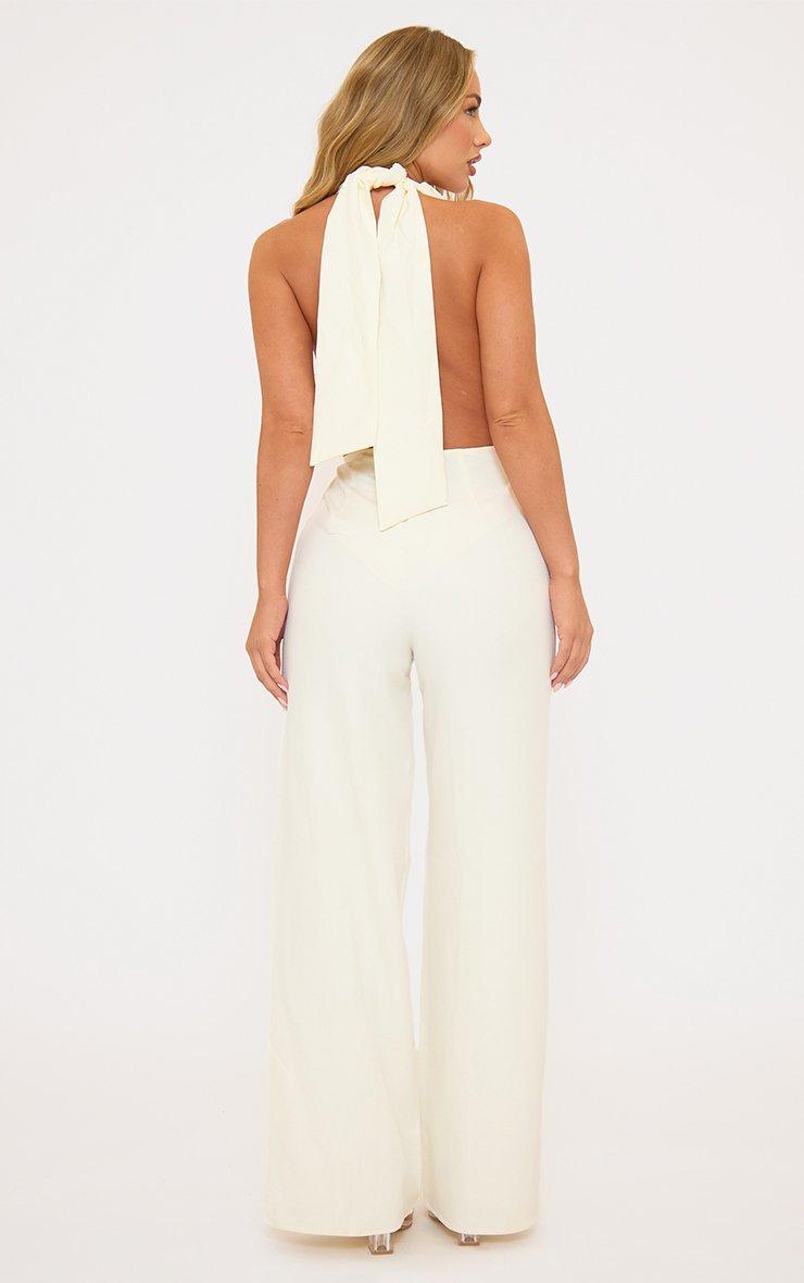 Plunge Halterneck Ruffle Trim Detail Playsuit In Cream Texture