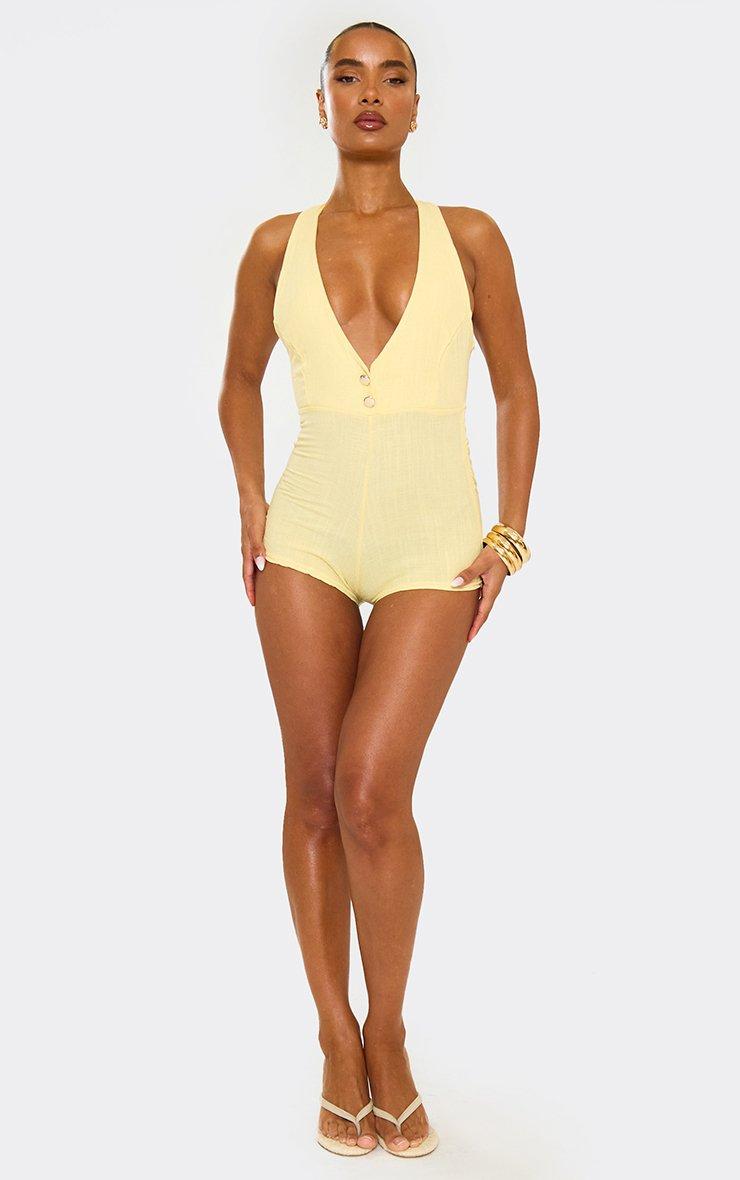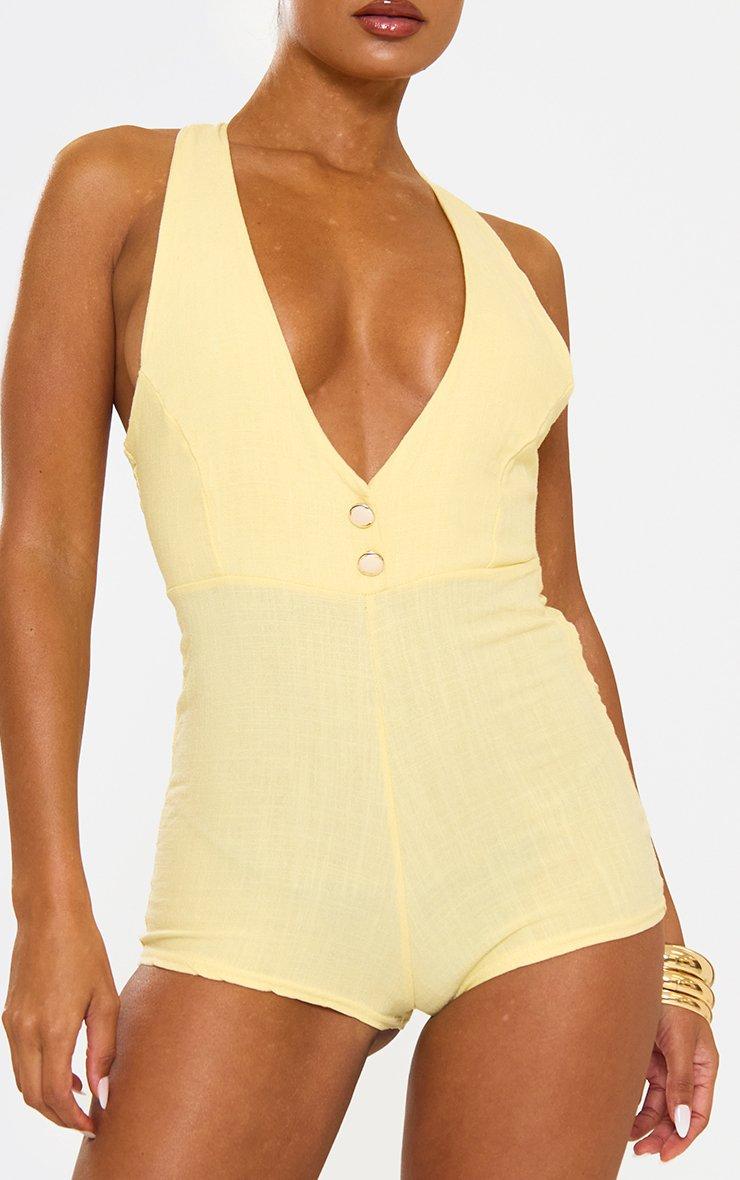 Plunge Neck Button Front Micro Playsuit In Yellow Linen