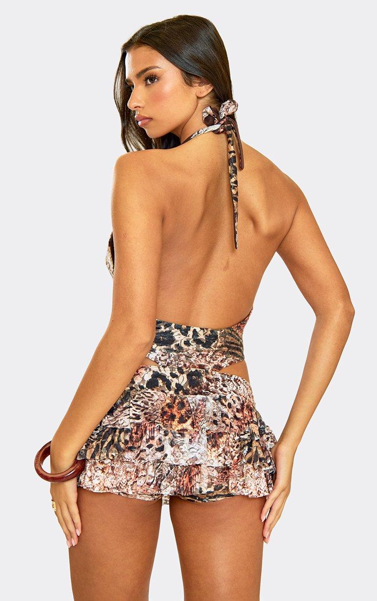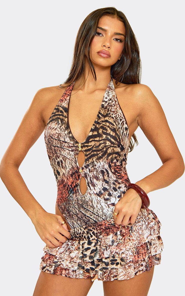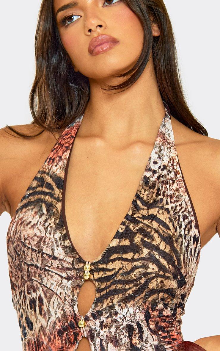 Halterneck Cut Out Bead Detail Bodysuit In Brown Multi Print