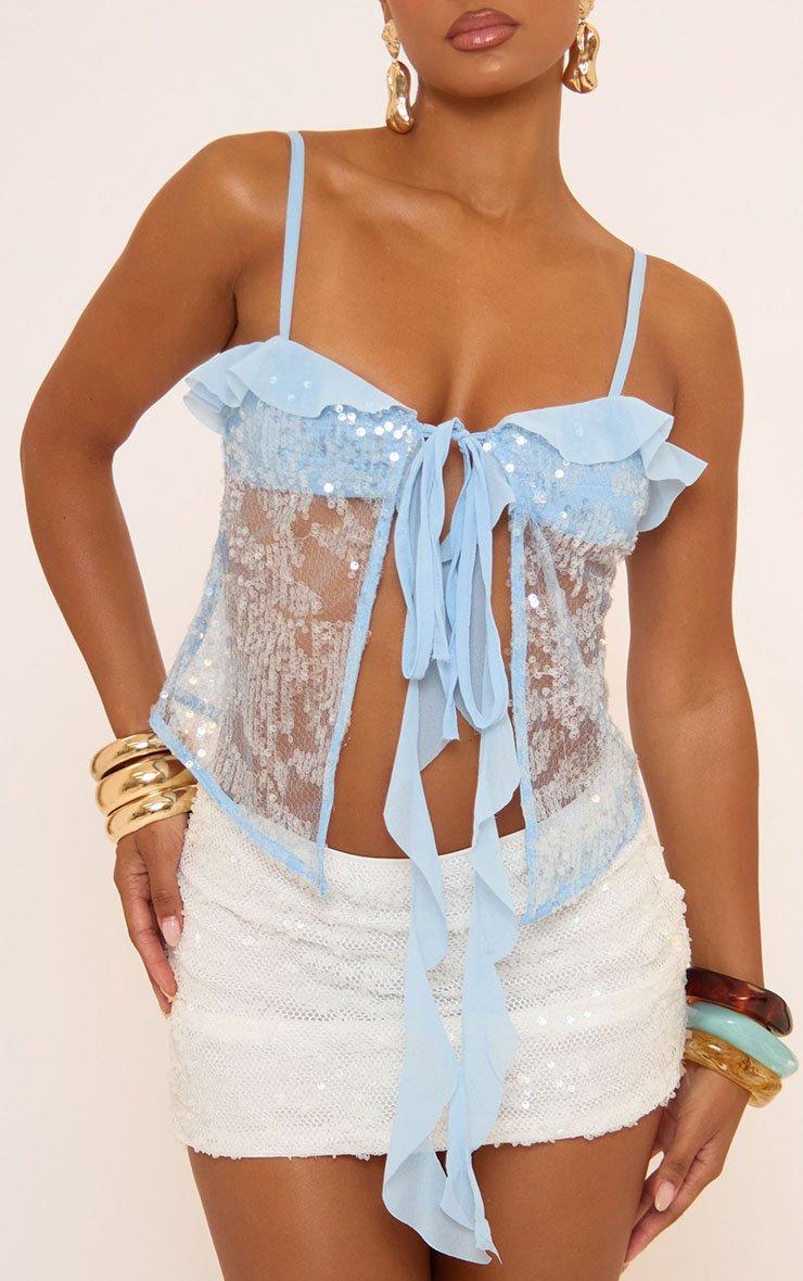 Strappy Tie Front Ruffle Detail Cami Top In Blue Sequin