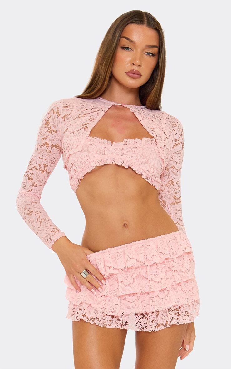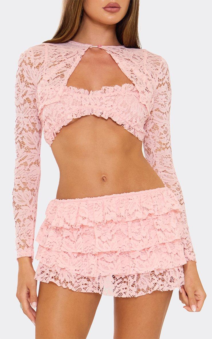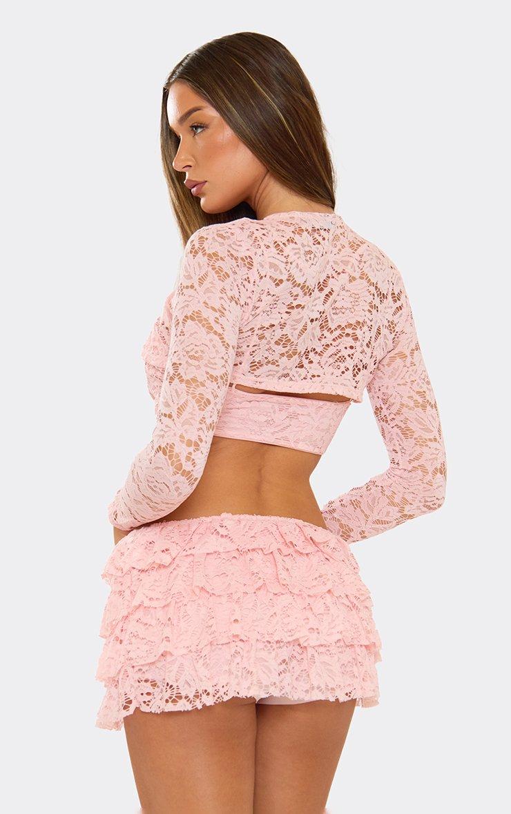 Button Neck Long Sleeved Split Front Top In Pink Lace