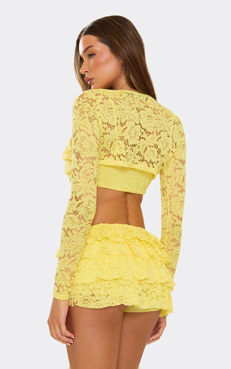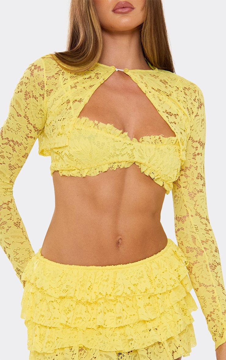 Button Neck Long Sleeved Split Front Top In Yellow Lace