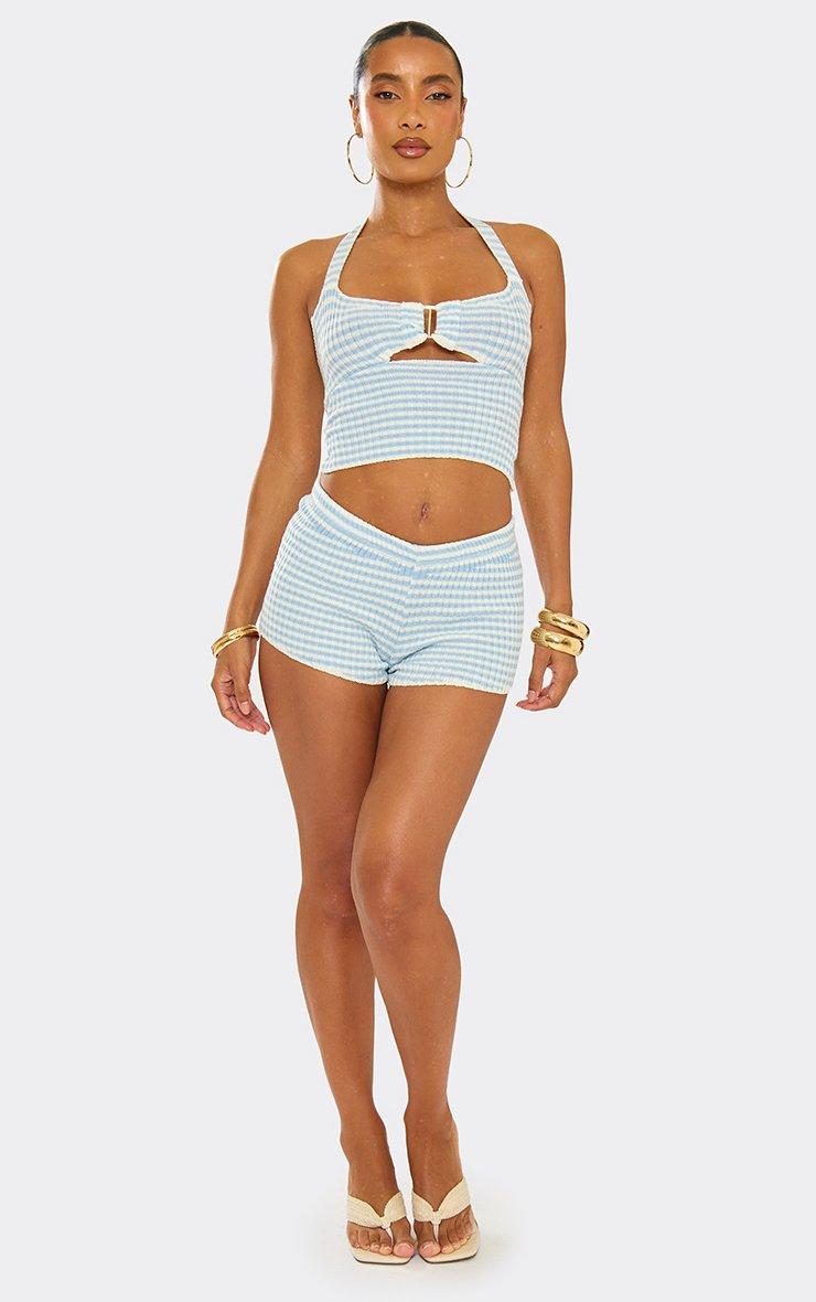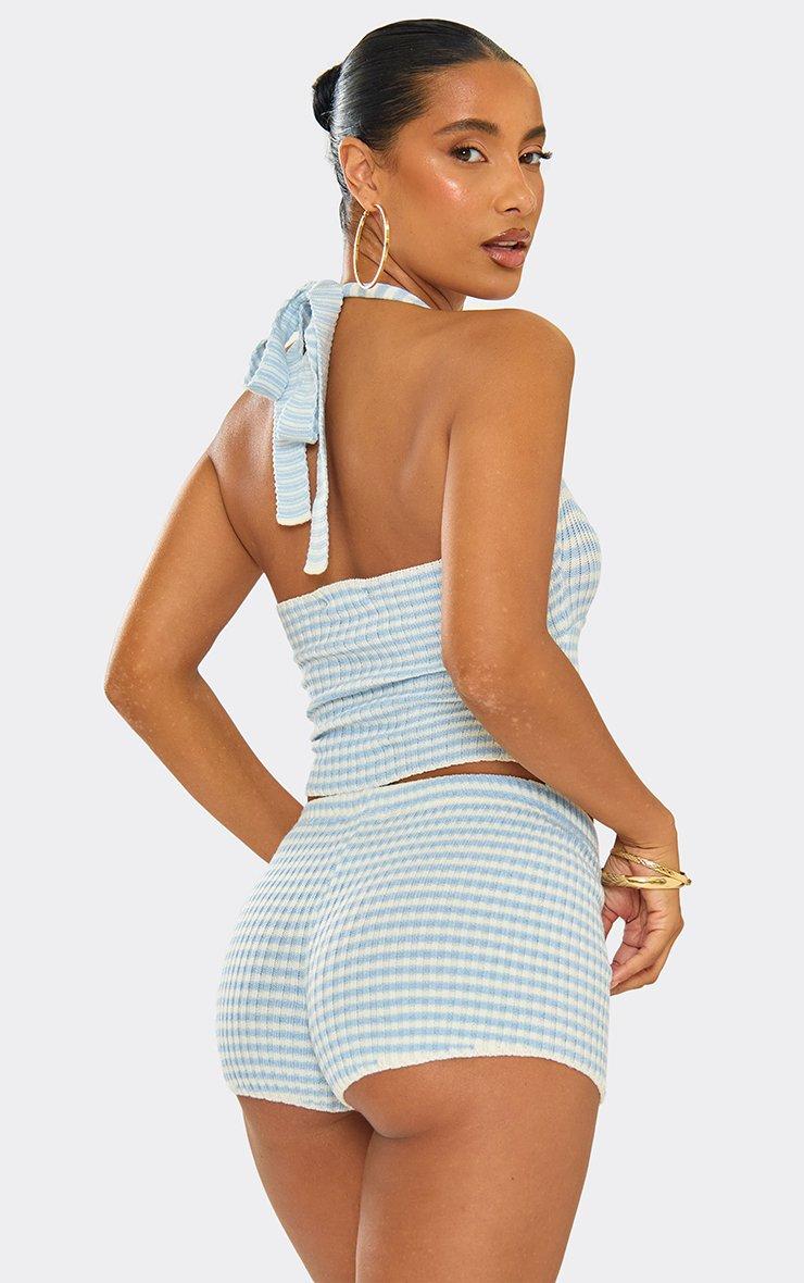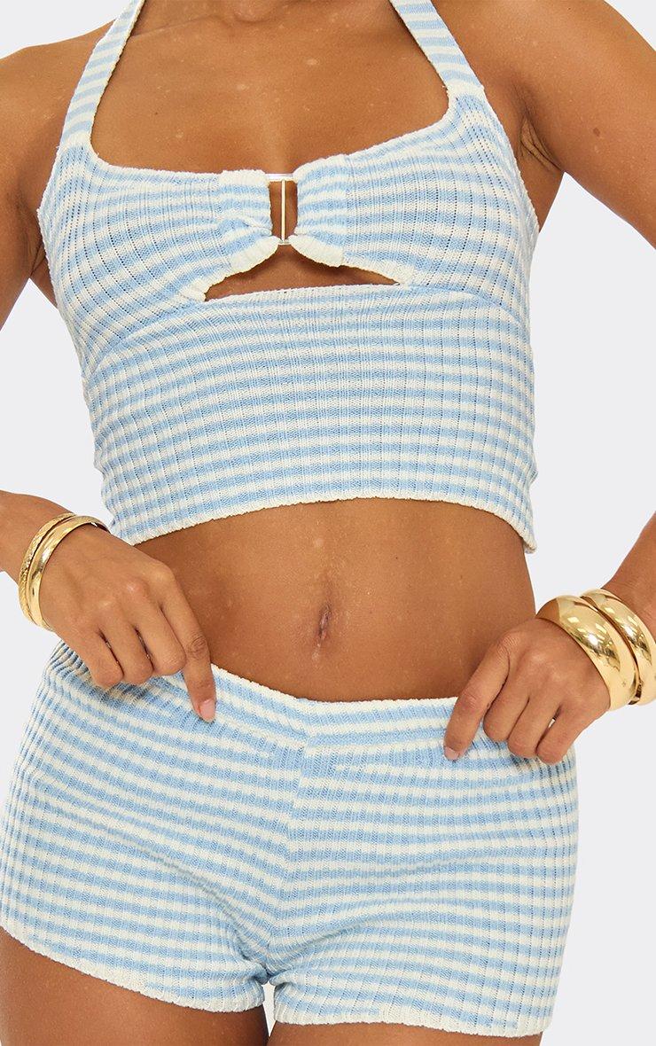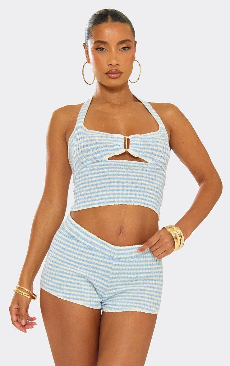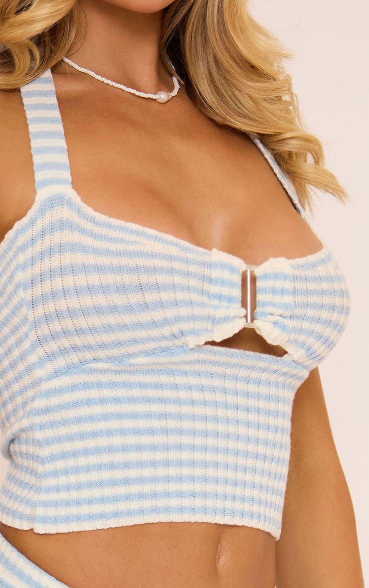Halterneck Buckle Detail Top In Baby Blue Stripe Knit