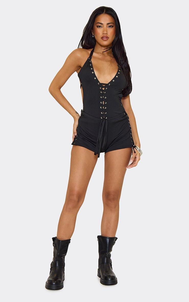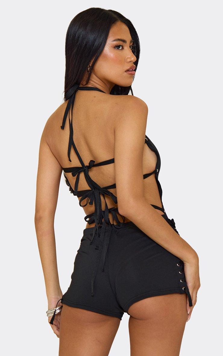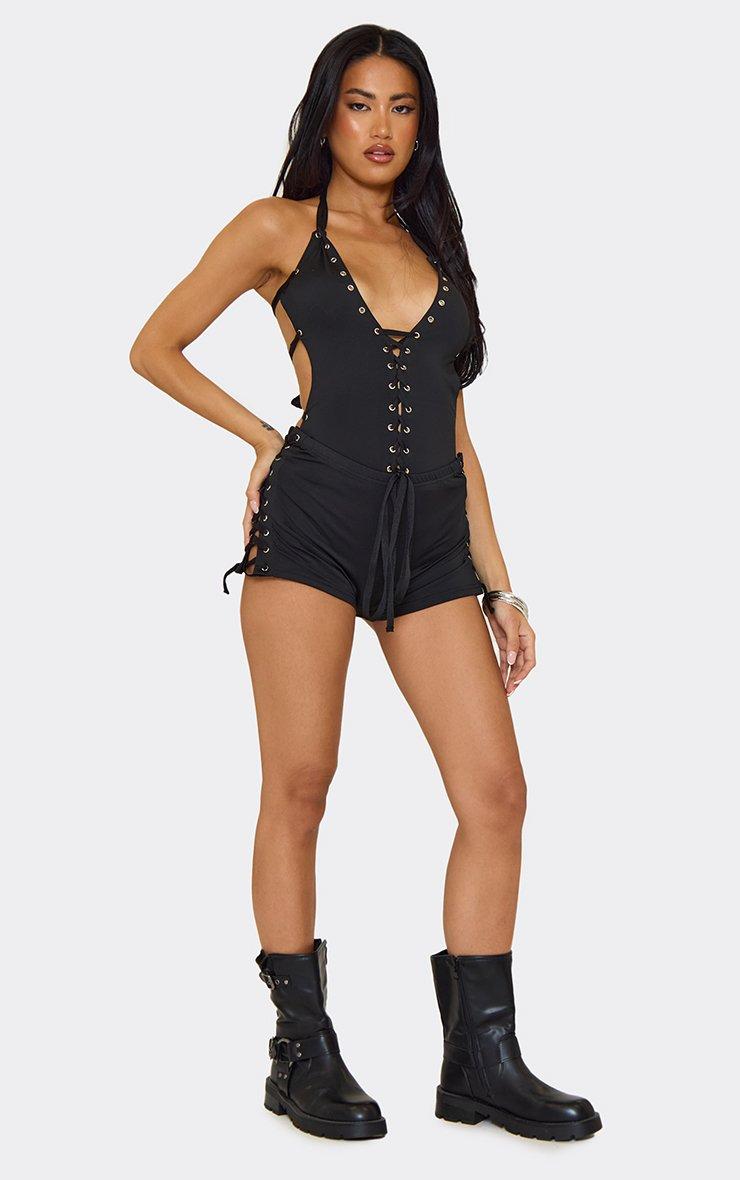 Mid Rise Lace Up Eyelet Detail Hot Pants In Black
