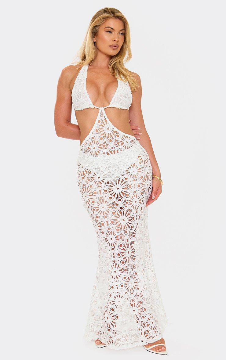 Plunge Neck Cut Out Maxi Dress In White Crochet Lace