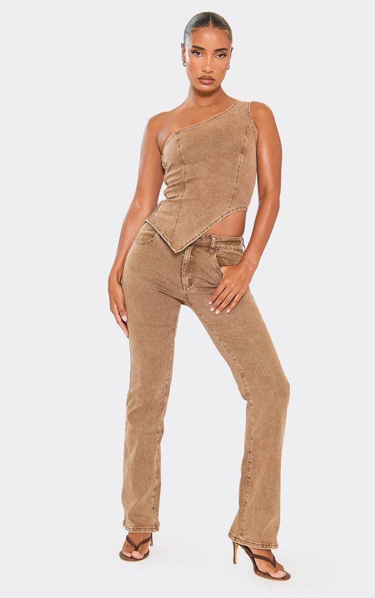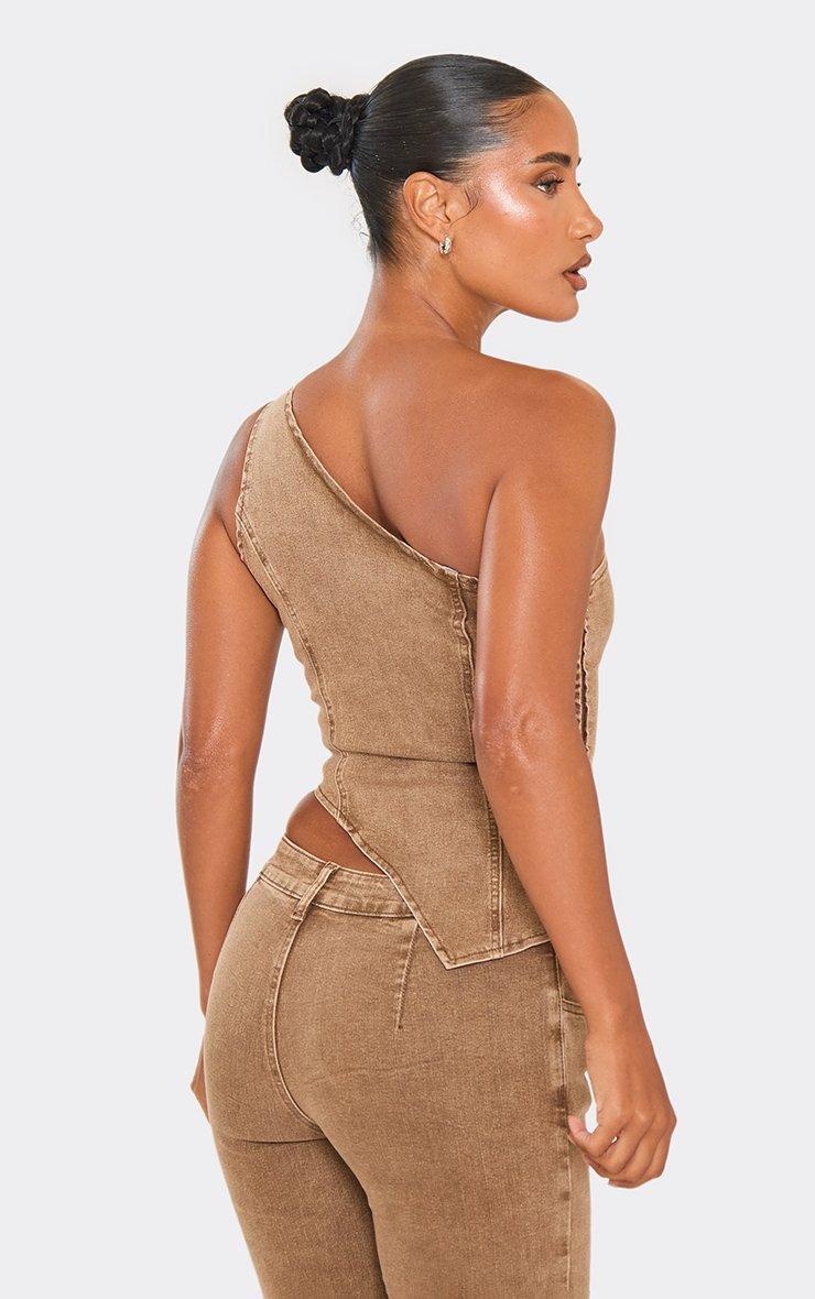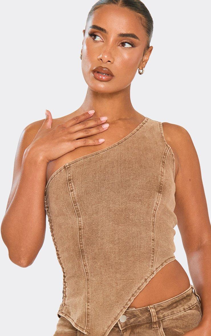 One Shoulder Asymmetric Hem Fitted Top In Washed Brown Denim