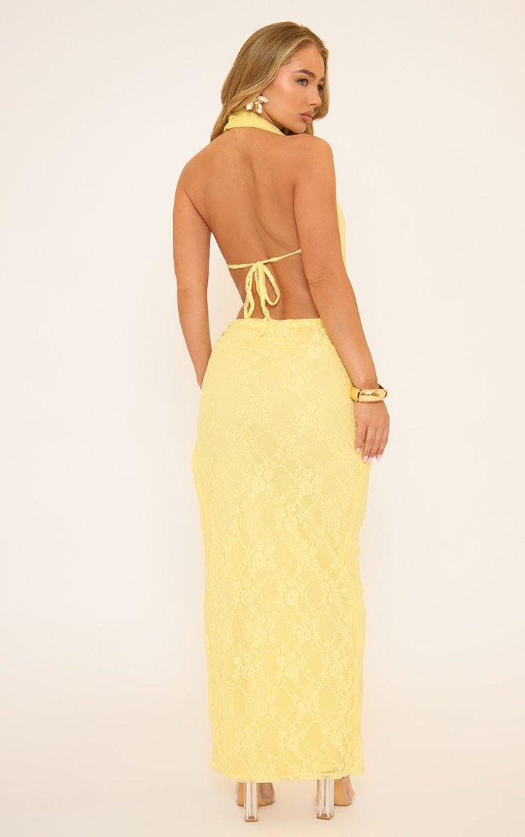 Halterneck Plunge Front Open Back Detail Maxi Dress In Yellow Lace
