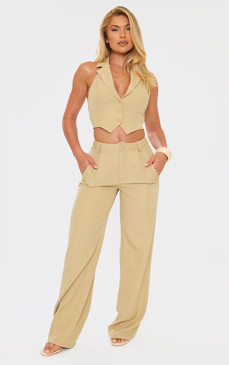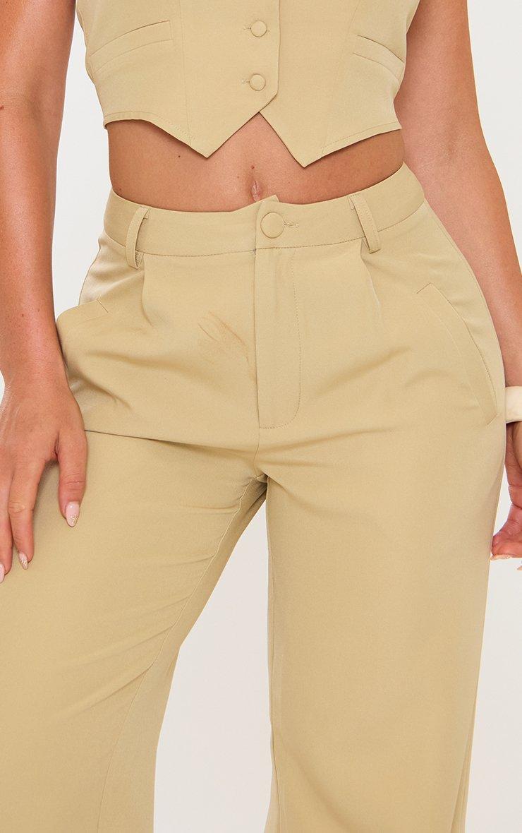 Low Rise Tie Waist Wide Leg Detail Trousers In Sage Green Linen