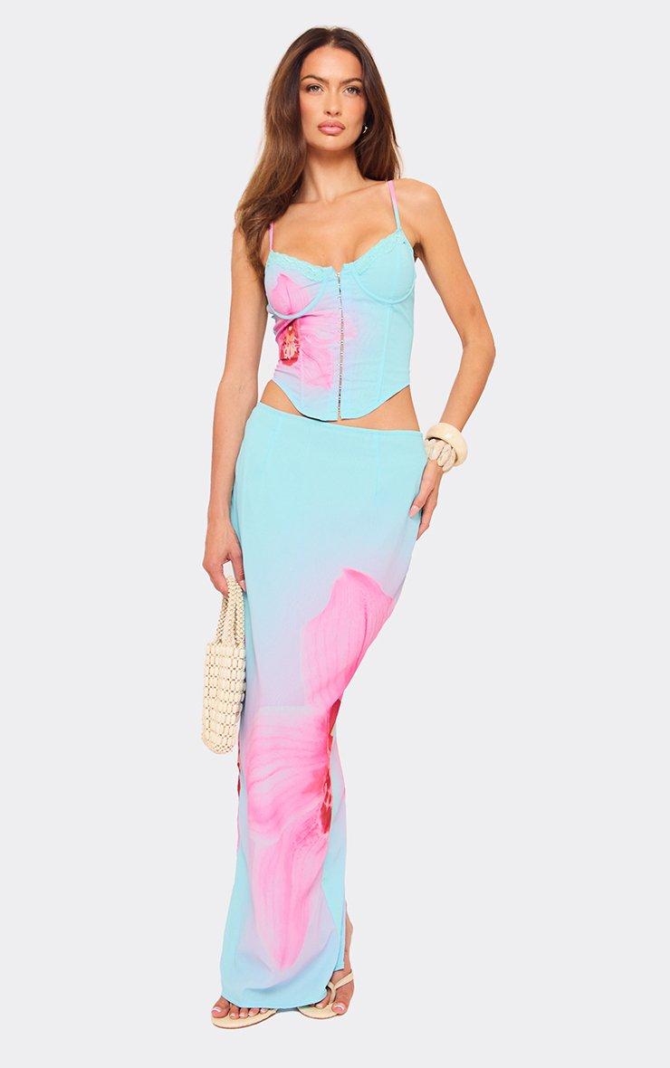 Low Rise Ruched Side Detail Maxi Skirt In Baby Blue Lace