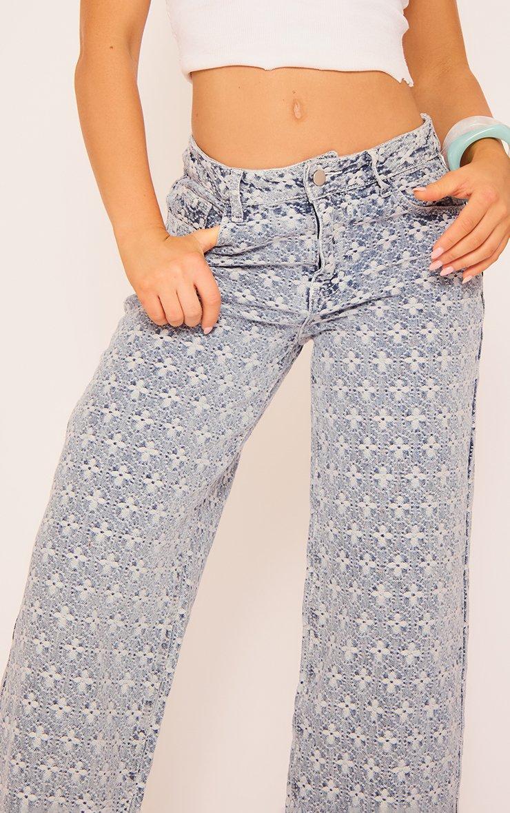 mid rise wide leg distresses logo pattern detail jean in blue denim