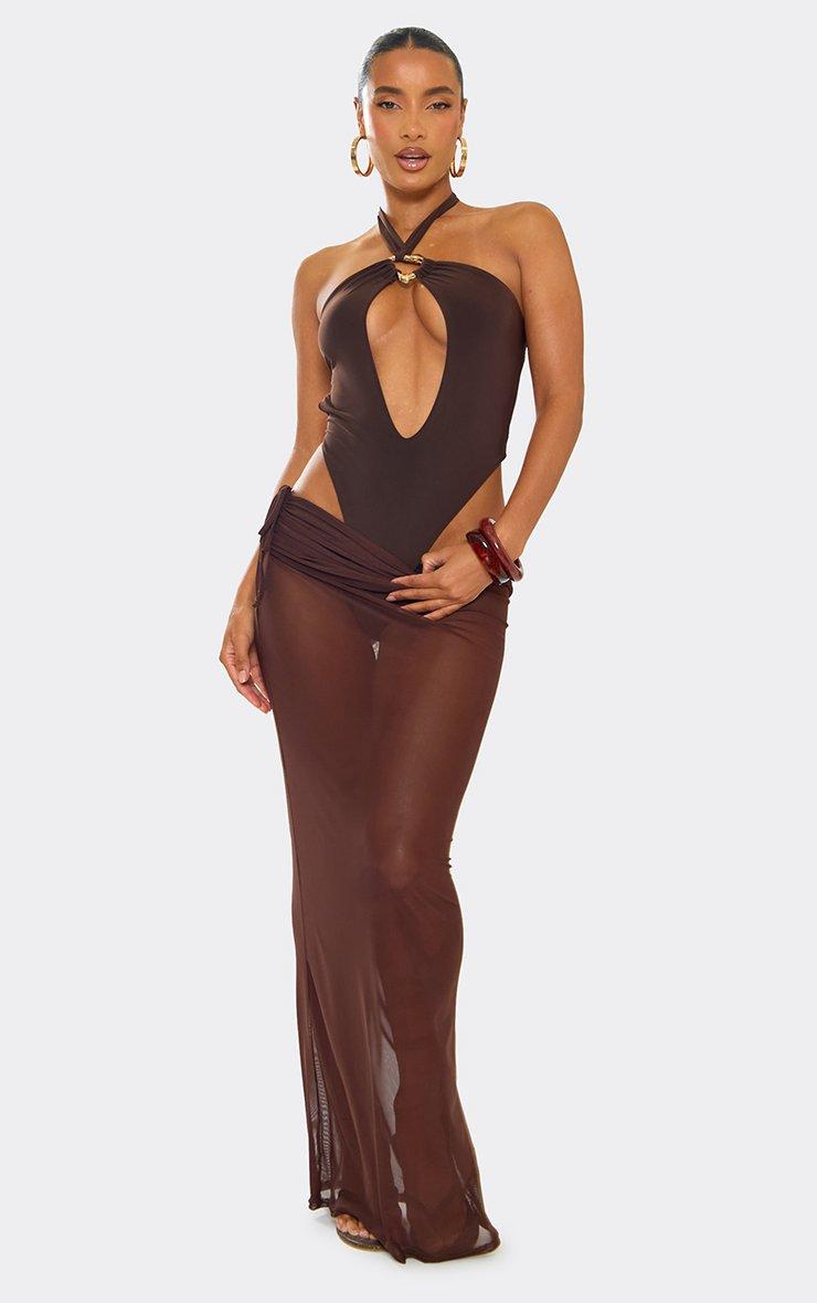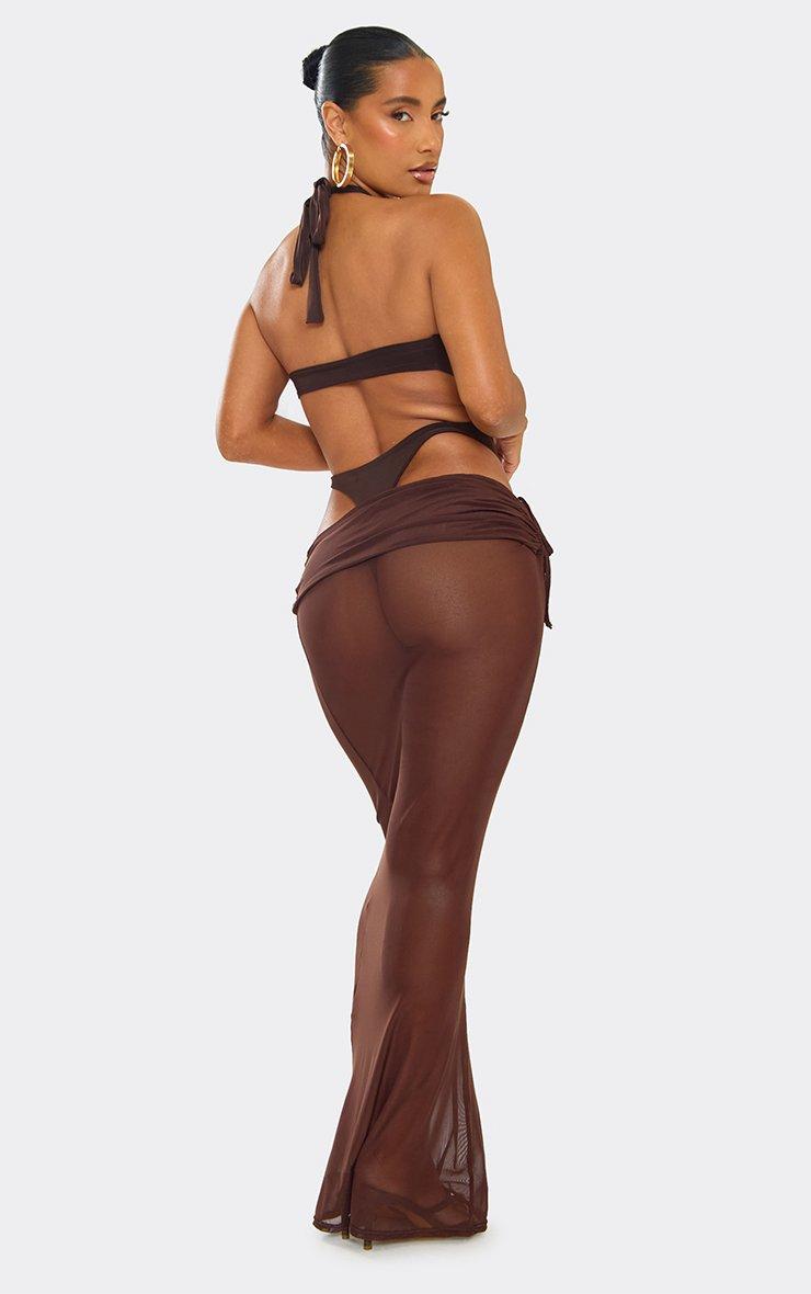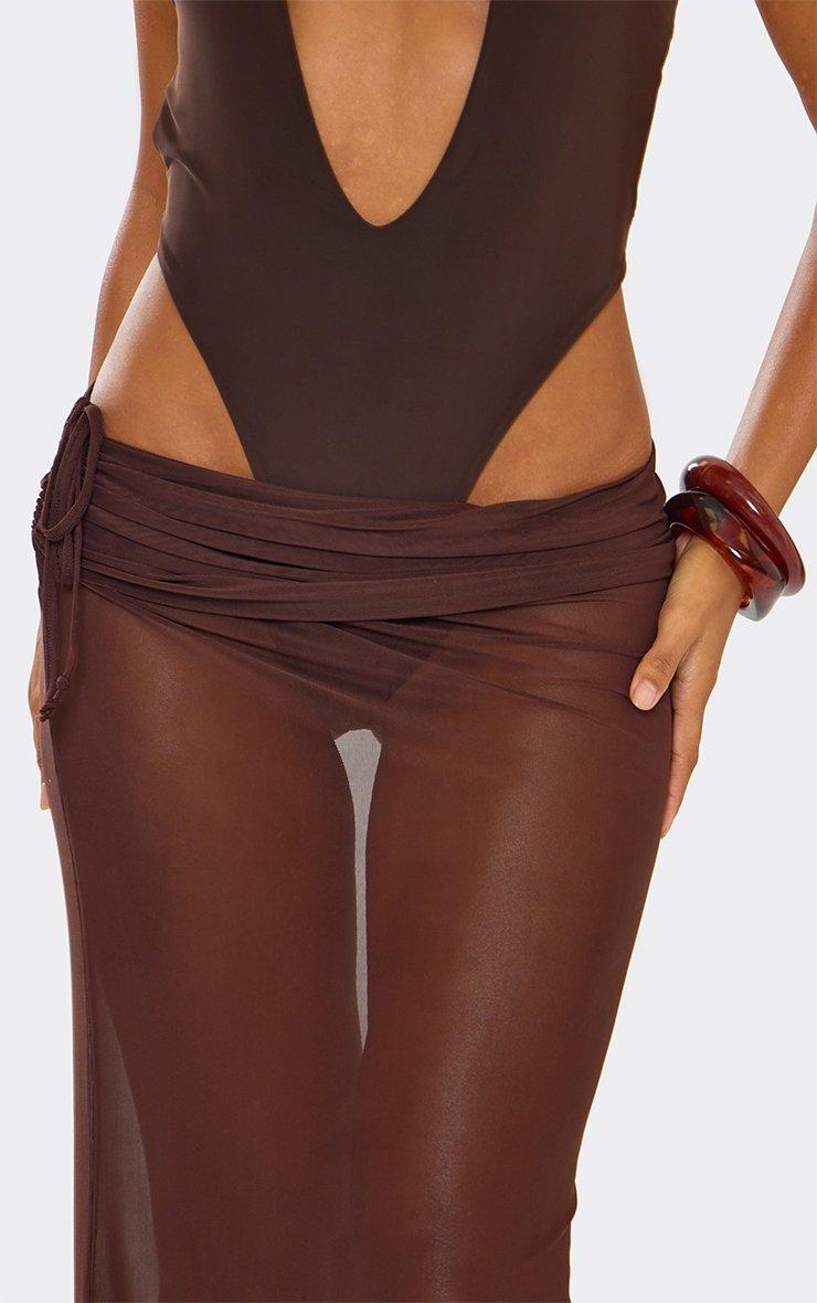 Low Waist Fold Over Tie Side Detail Ruched Maxi Skirt In Brown Mesh