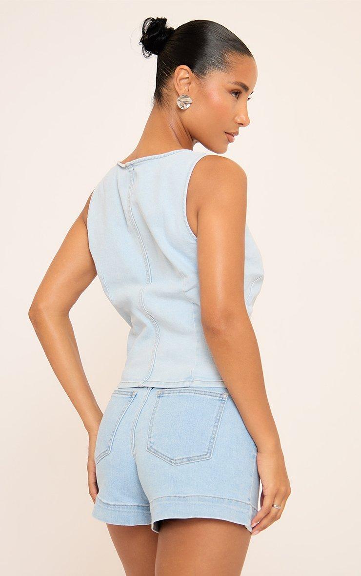 Sleeveless Button Front Asymmetric Waistcoat In Light Blue Denim
