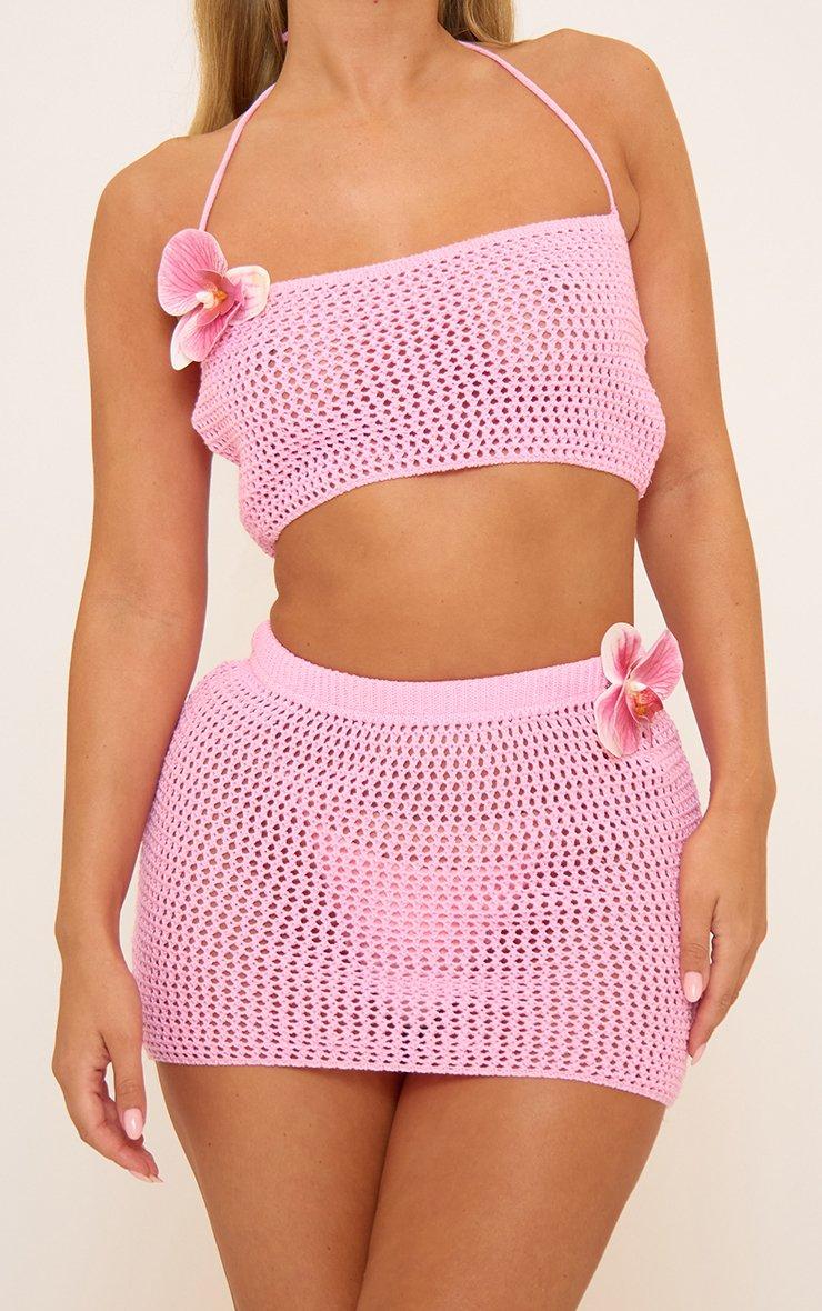 Strappy Halterneck Flower Trim Detail Crop Top In Pink Crochet Knit