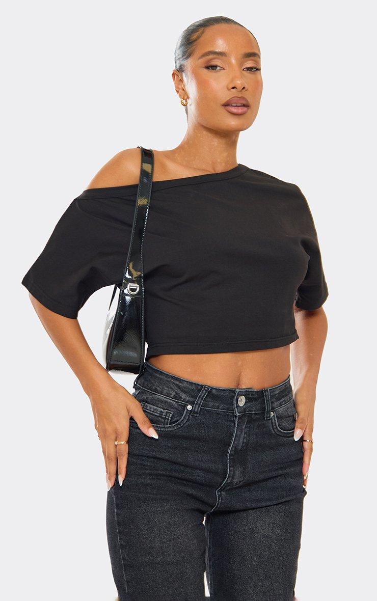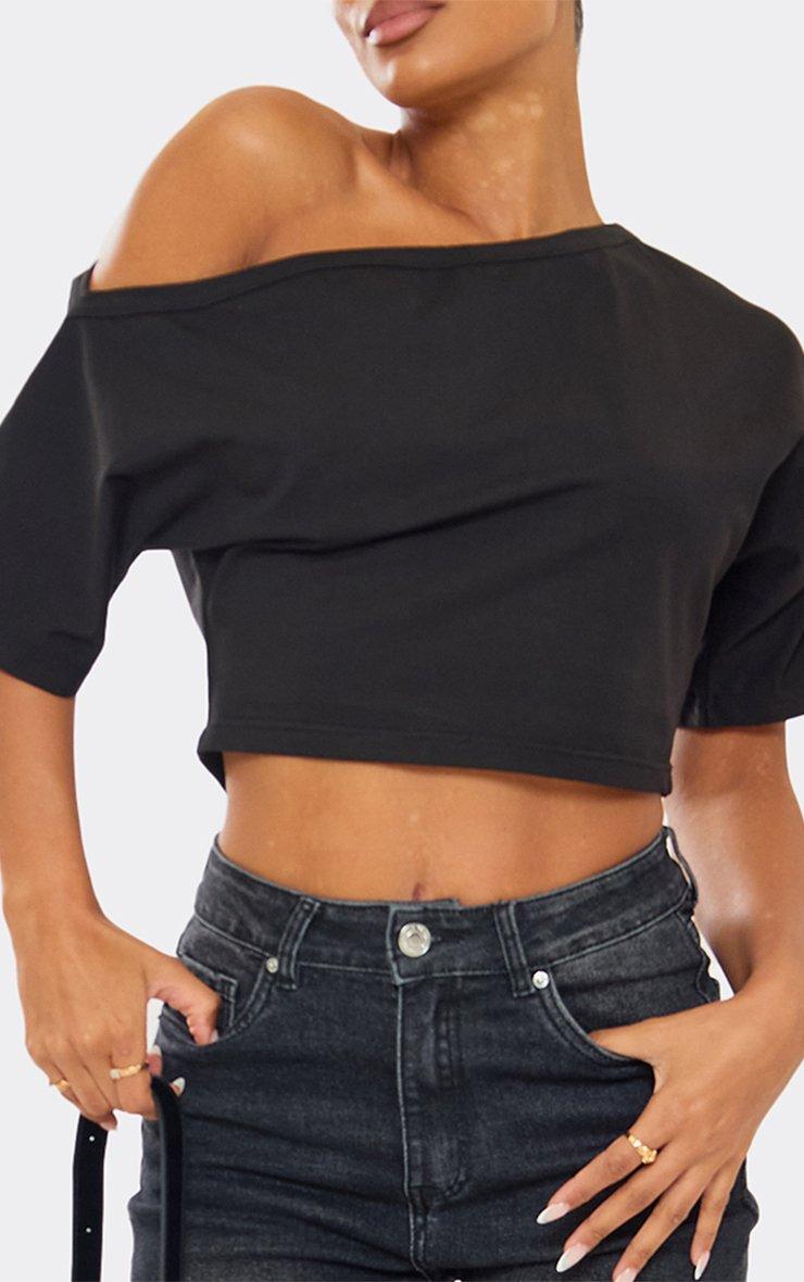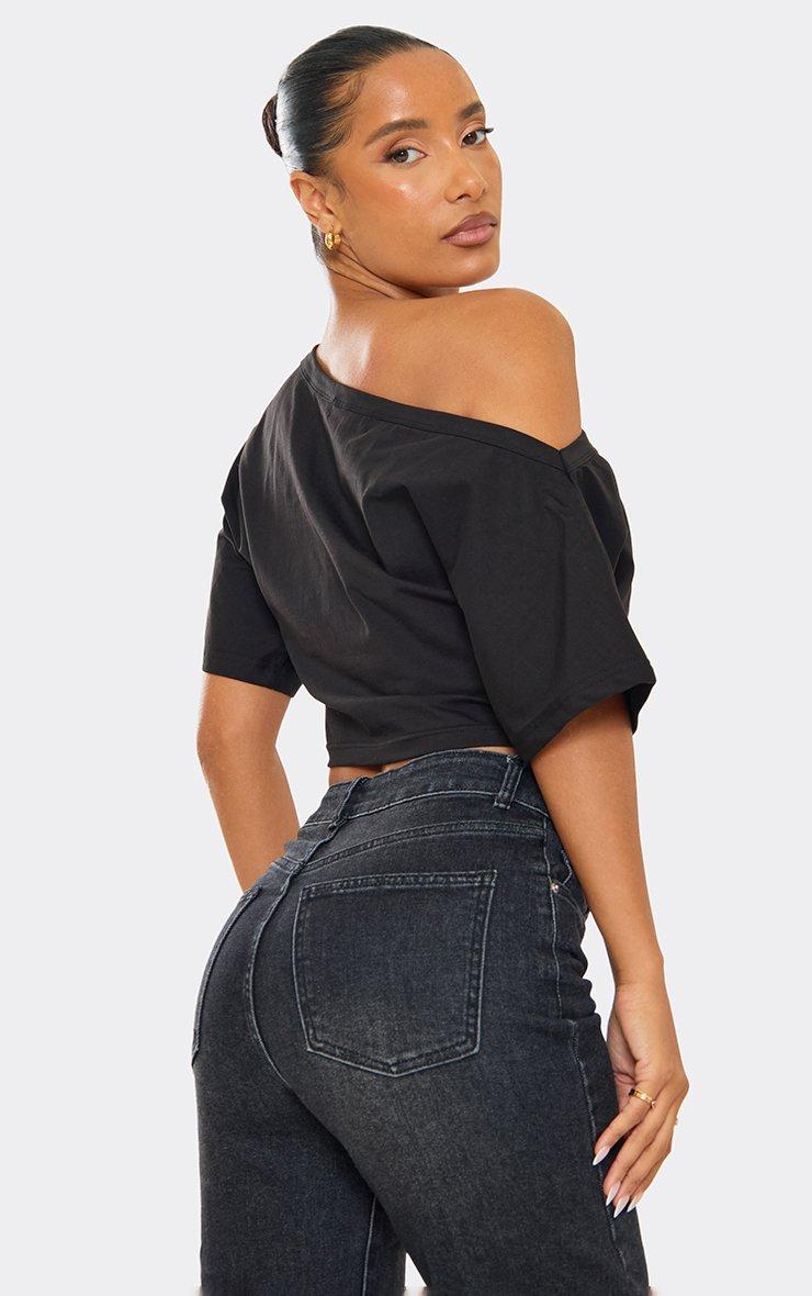 Slash Neck Off The Shoulder Cinched Waist Ruched T-Shirt In Black