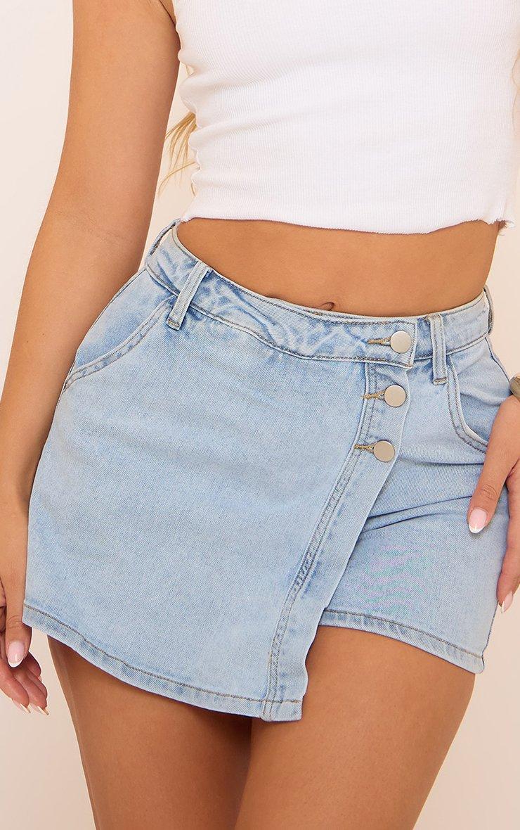 High Waist Seam Detail Wrap Over Skort In Blue Denim